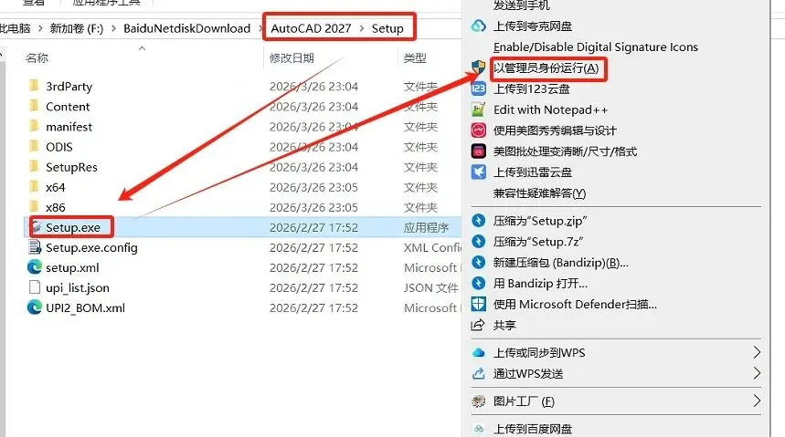 2.进入解压后的【Auto CAD 2027】-【Setup】文件夹,选择【Setup.exe】,鼠标右键,选择【以管理员身份运行】。