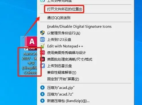 9.选择桌面【AutoCAD 2027】图标,右键,选择【打开文件所在位置】。