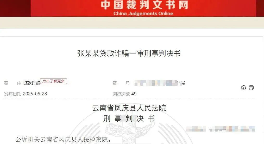 近日,云南省凤庆县人民法院审结一起贷款诈骗案。被告人张某某伙同他人使用虚假身份、伪造工资流水及公积金信息,骗取银行贷款20万元,被判处有期徒刑一年五个月,并处罚金2万元。