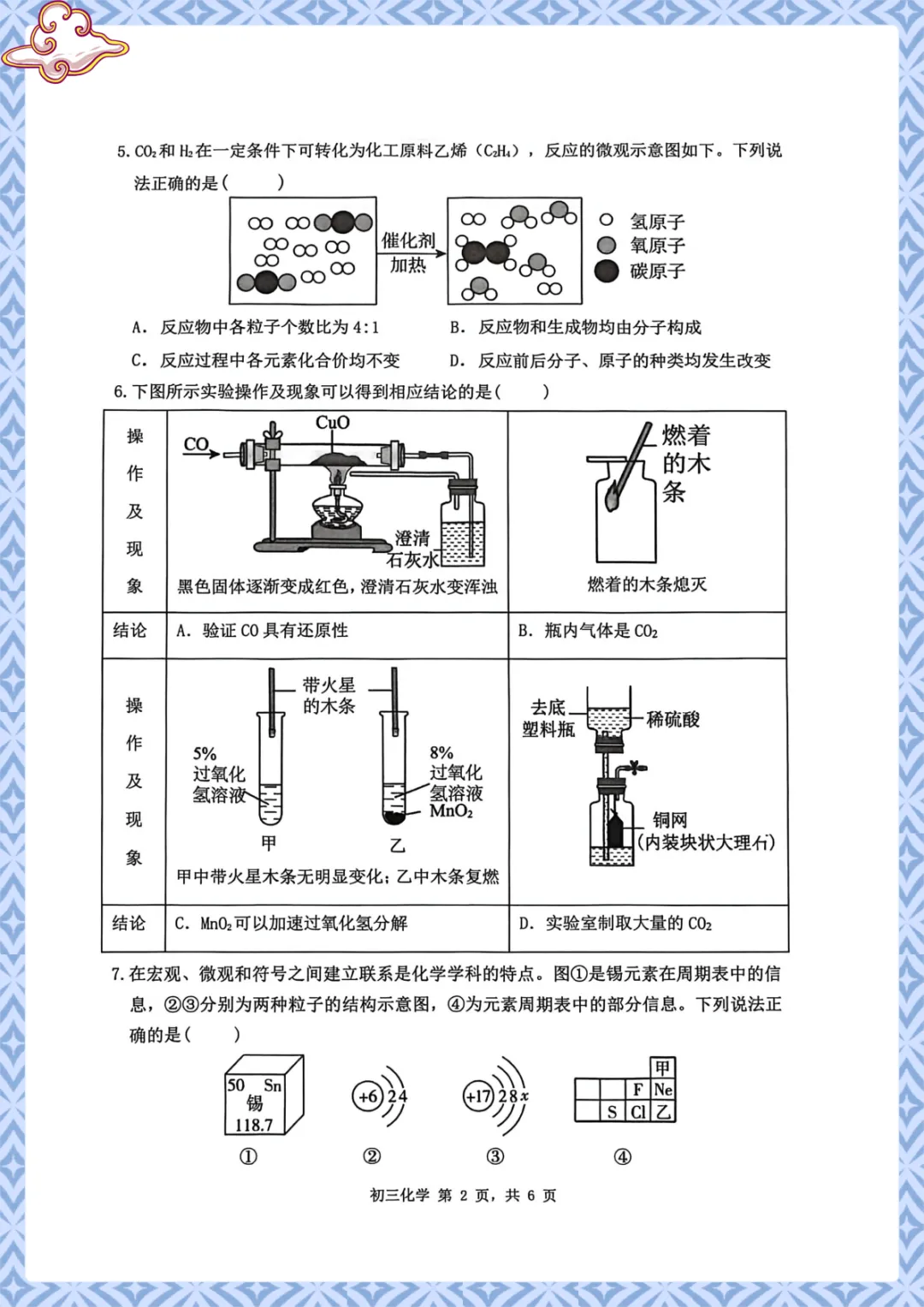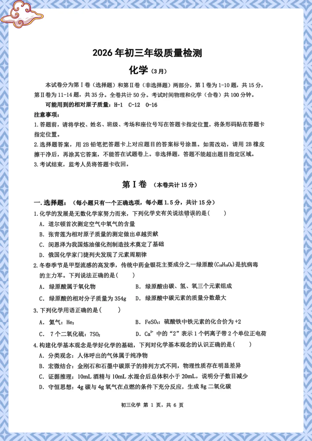 2026年中考第一次模拟化学测试卷电子版可下载打印(含答案)