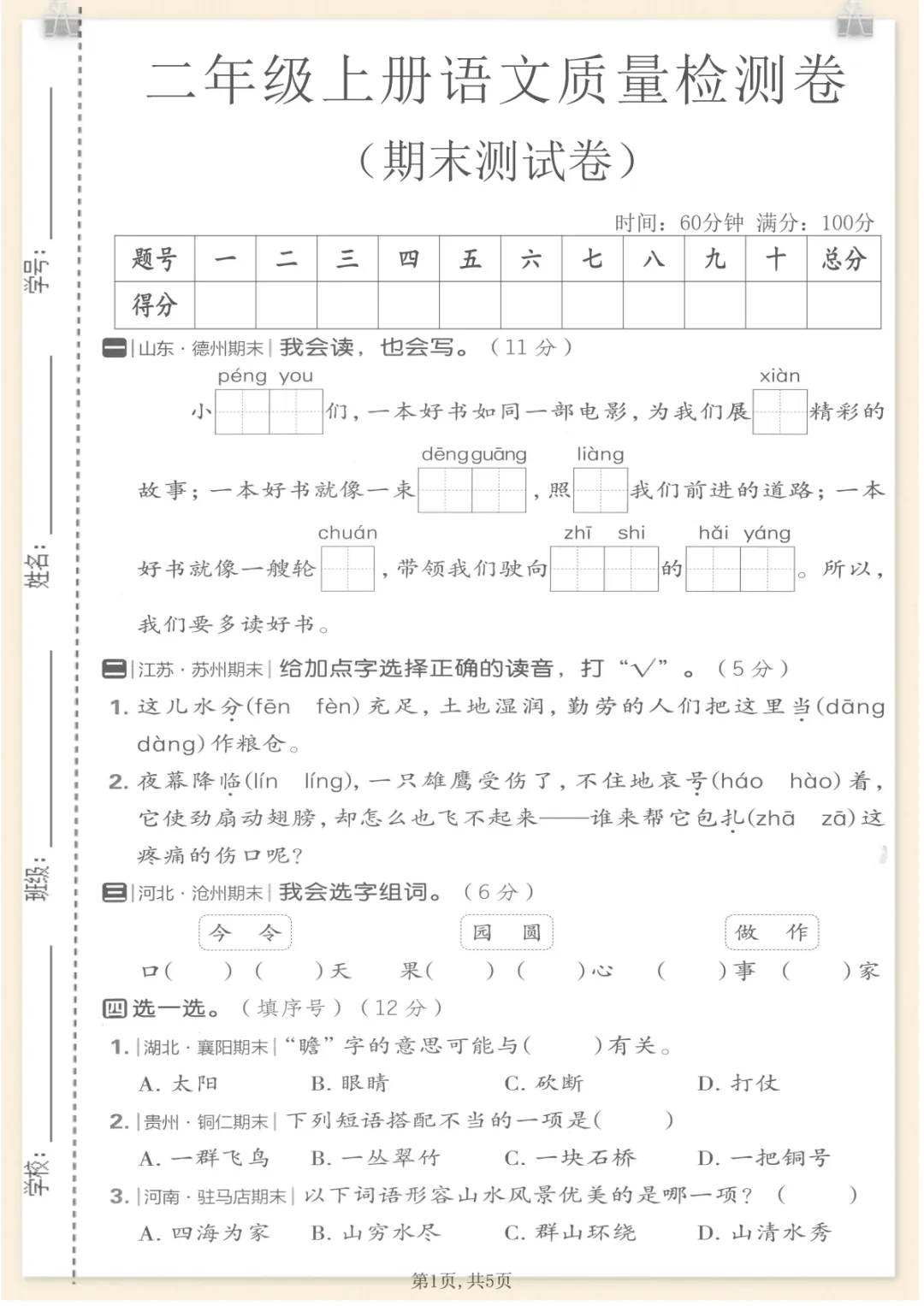 二年级上语文期末质量检测卷2,共5页,电子版可下载可打印,这份期末检测卷紧扣二年级语文上册学习内容,涵盖多个核心知识点与专项训练内容,适合孩子在期末阶段进行综合练习与查漏补缺,帮助进一步巩固基础、熟悉题型、提升答题能力。需要的家长可以及时下载打印出来,让孩子练一练。
