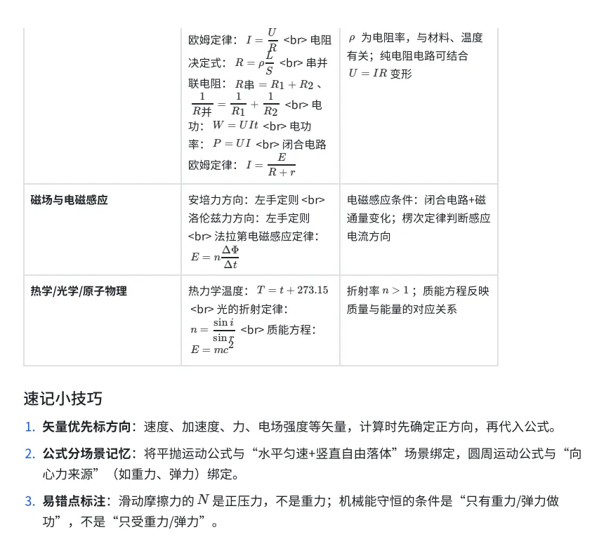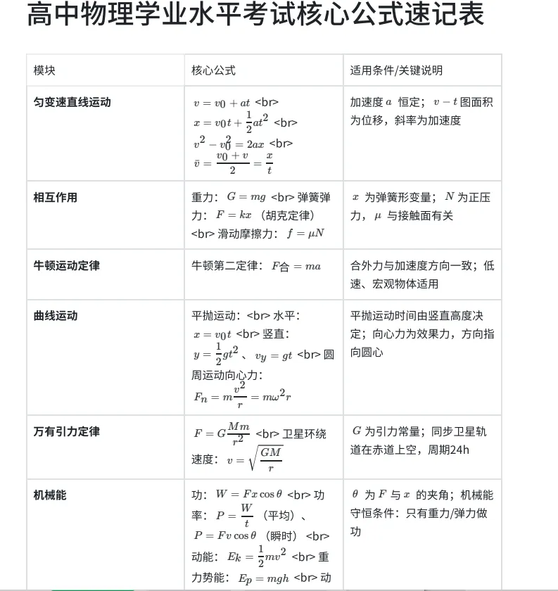 高中物理学业水平考试核心公式速记表