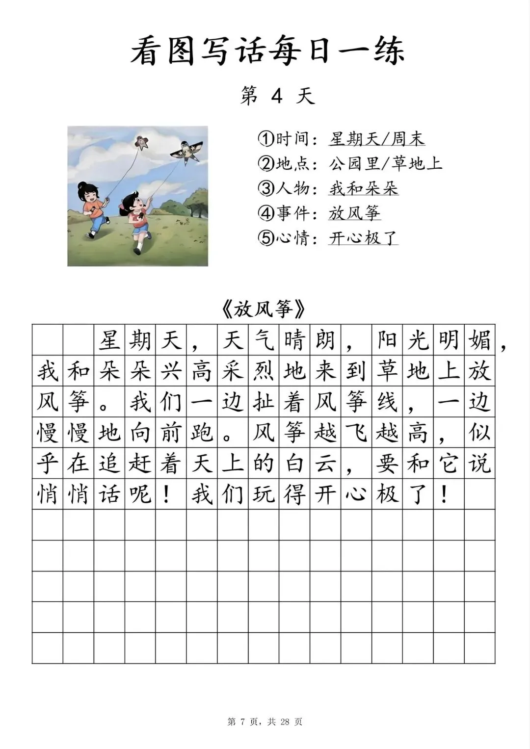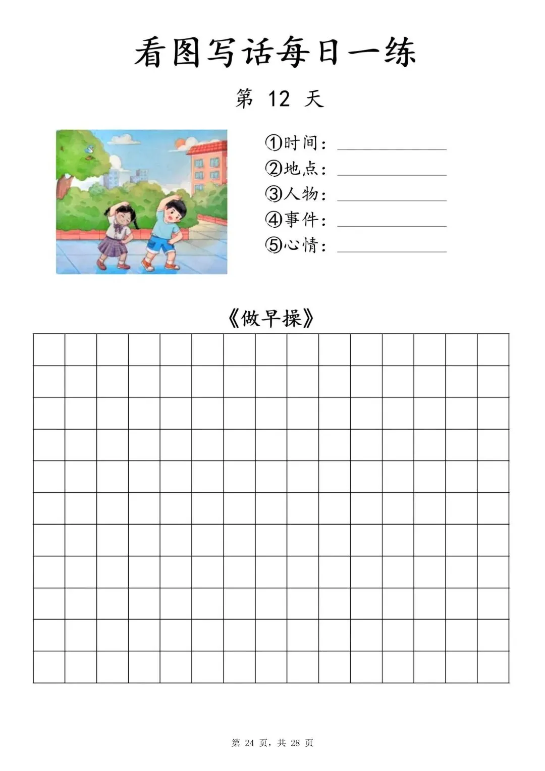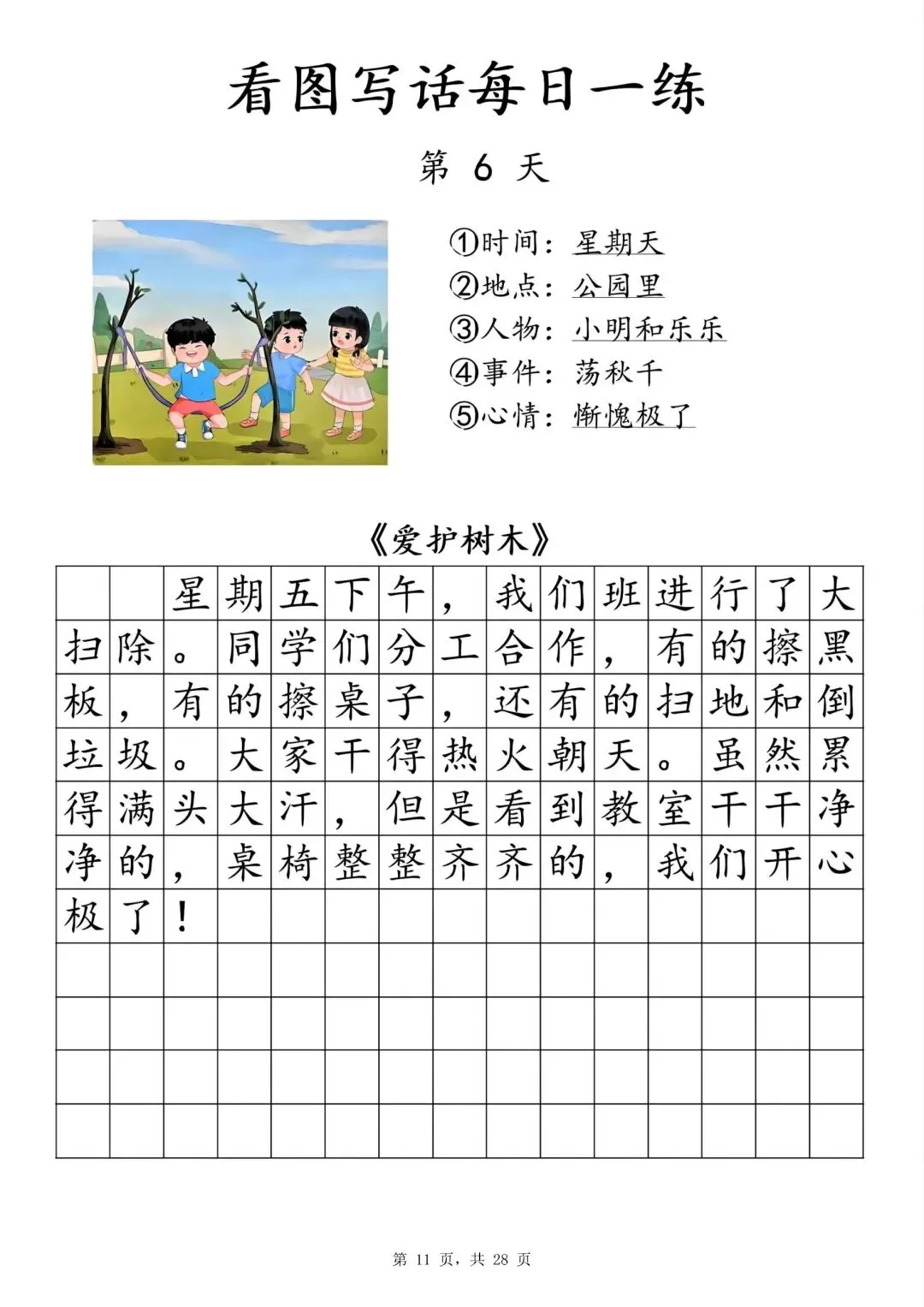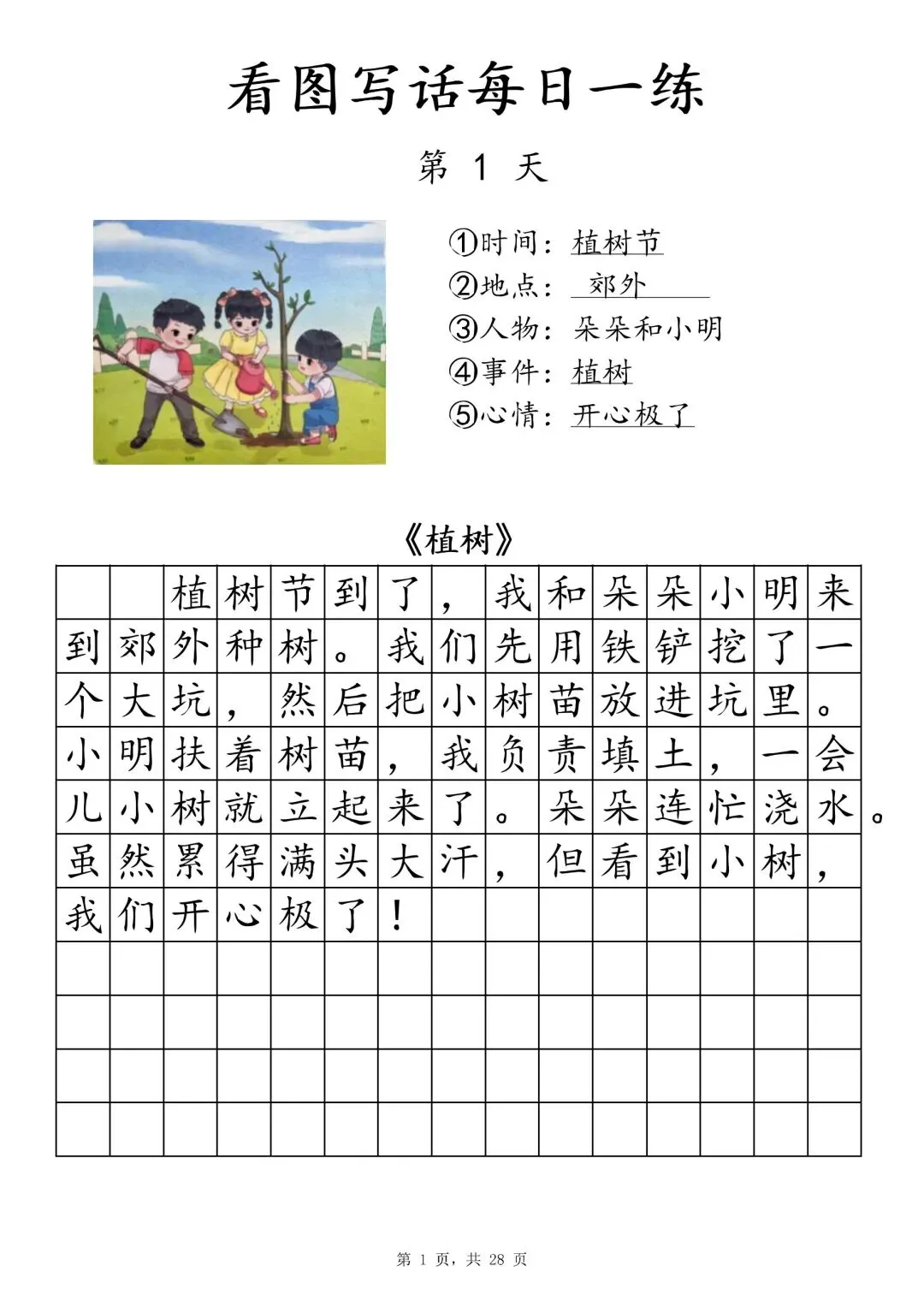 【一年级下册看图写话每日一练】PDF电子版,内容全,29页,包含植树、做操、放风筝、让座等场景,带范文和写作支架,适合一二年级孩子同步练习,提升写作能力~