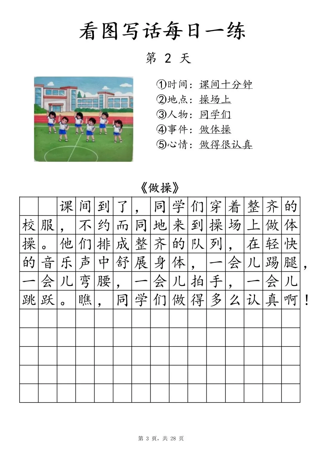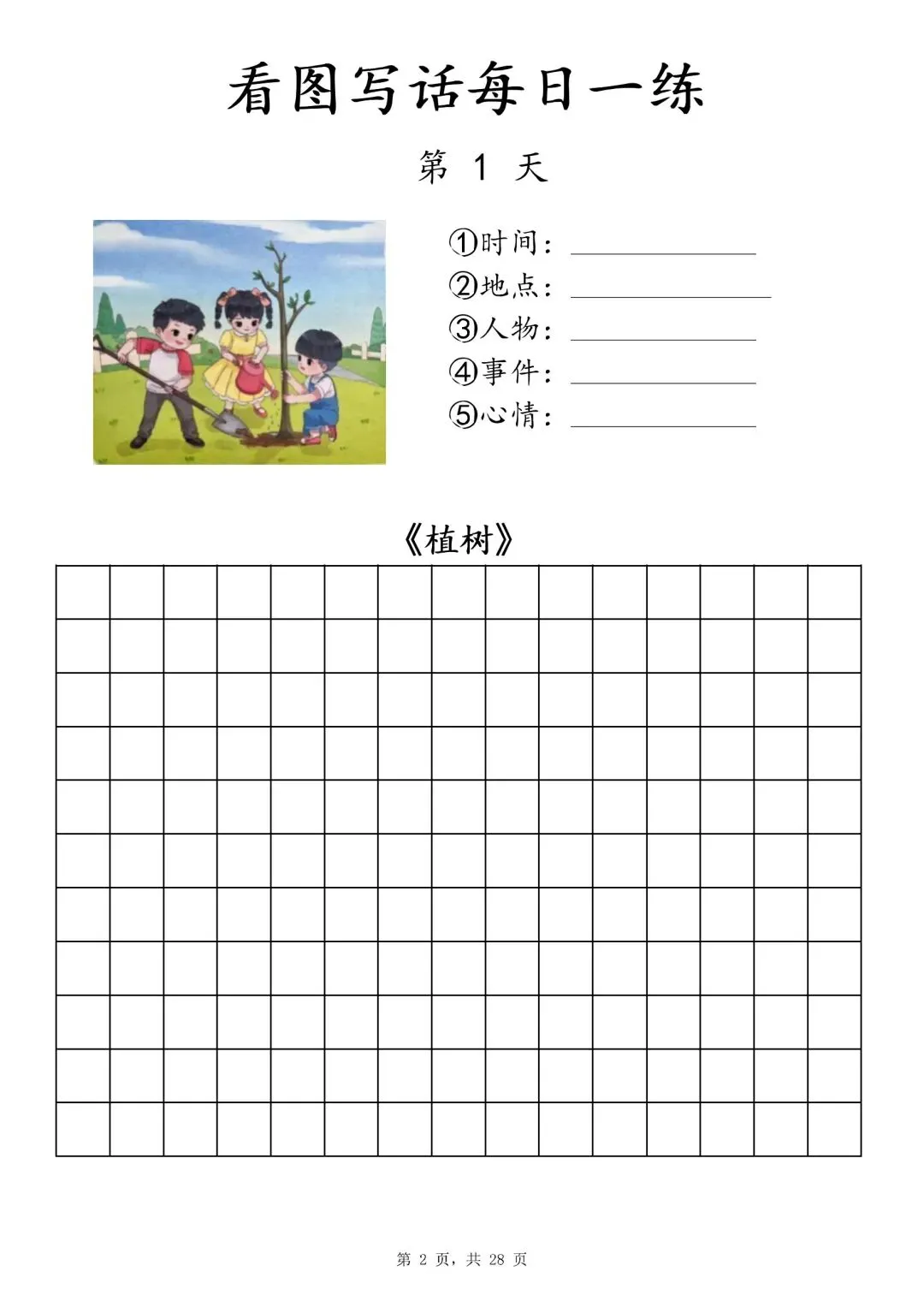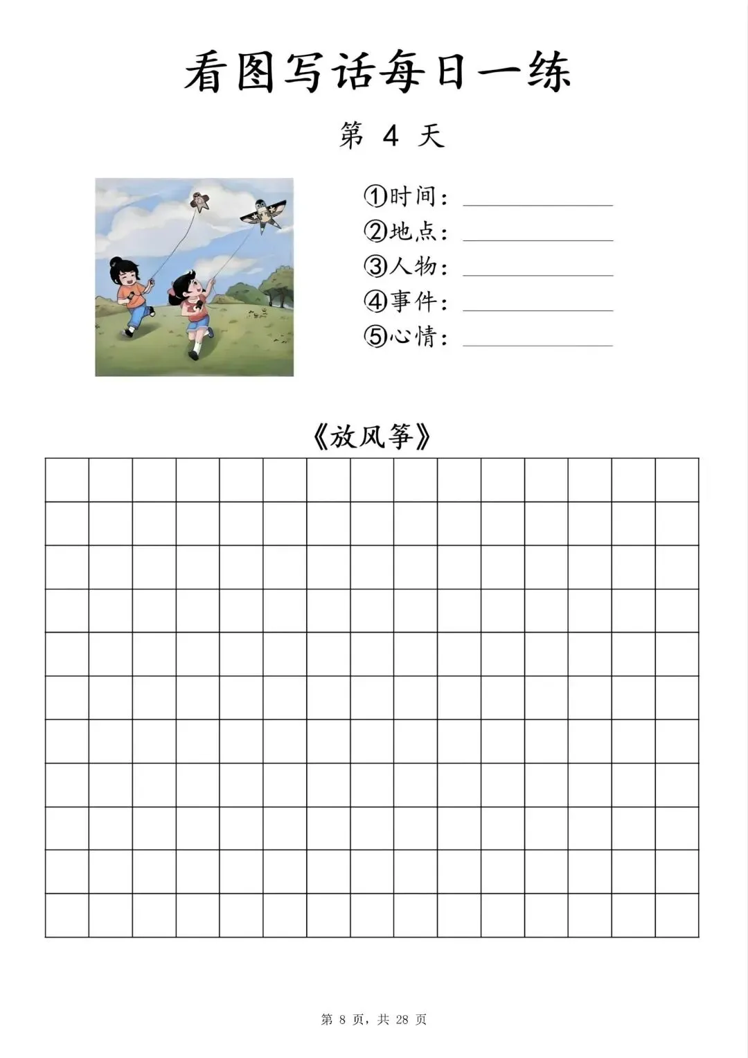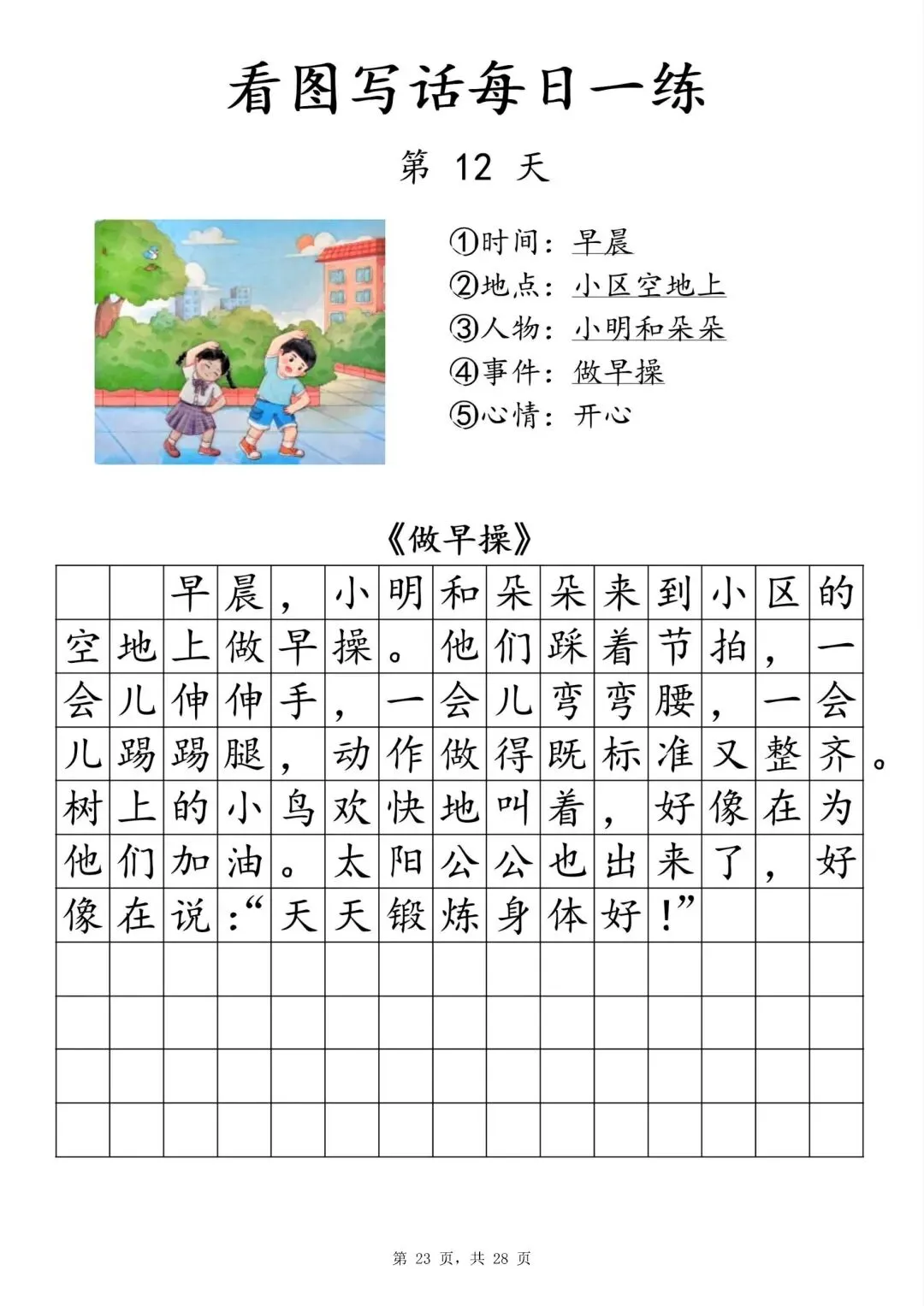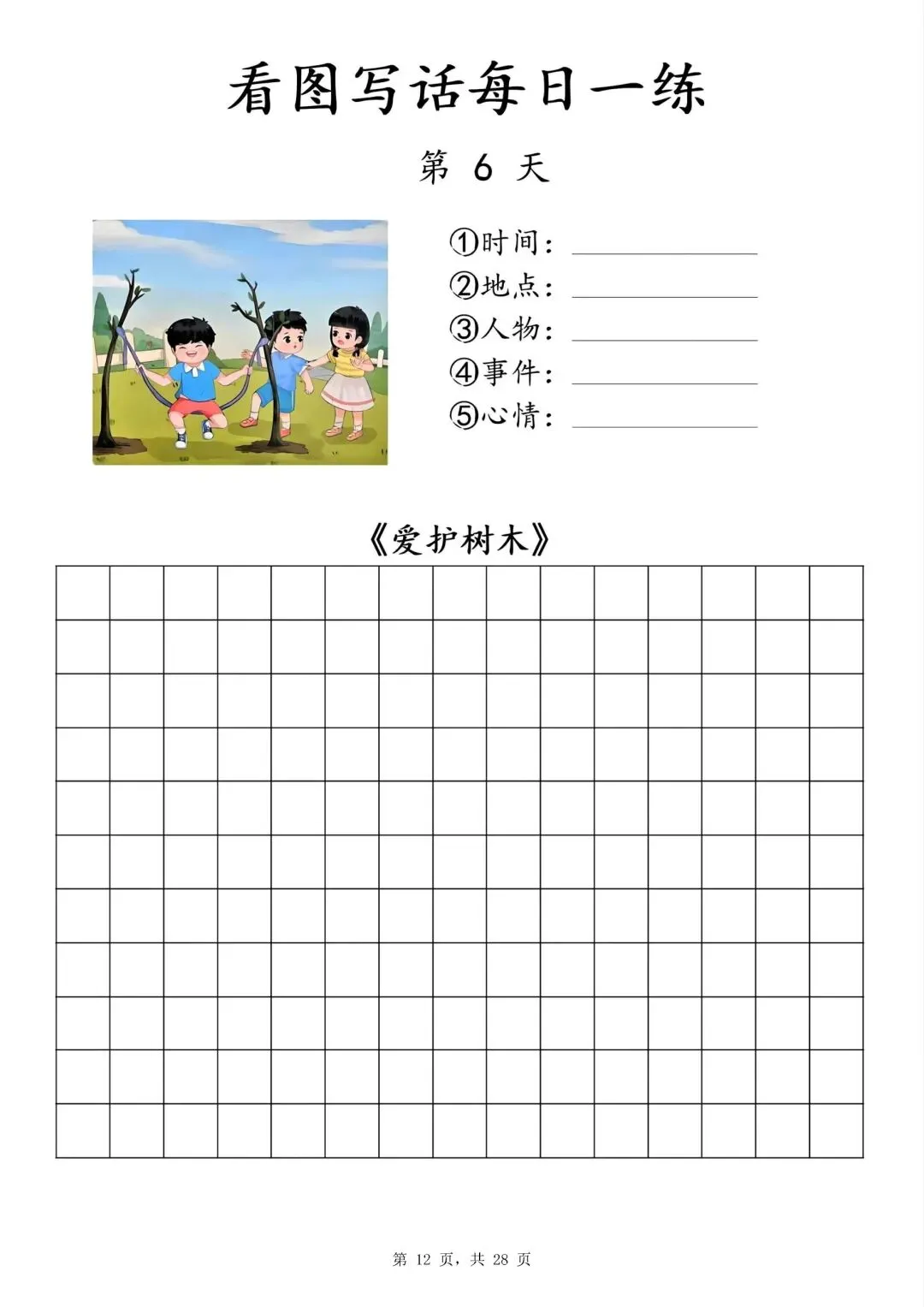 【一年级下册看图写话每日一练】PDF电子版,内容全,29页,包含植树、做操、放风筝、让座等场景,带范文和写作支架,适合一二年级孩子同步练习,提升写作能力~