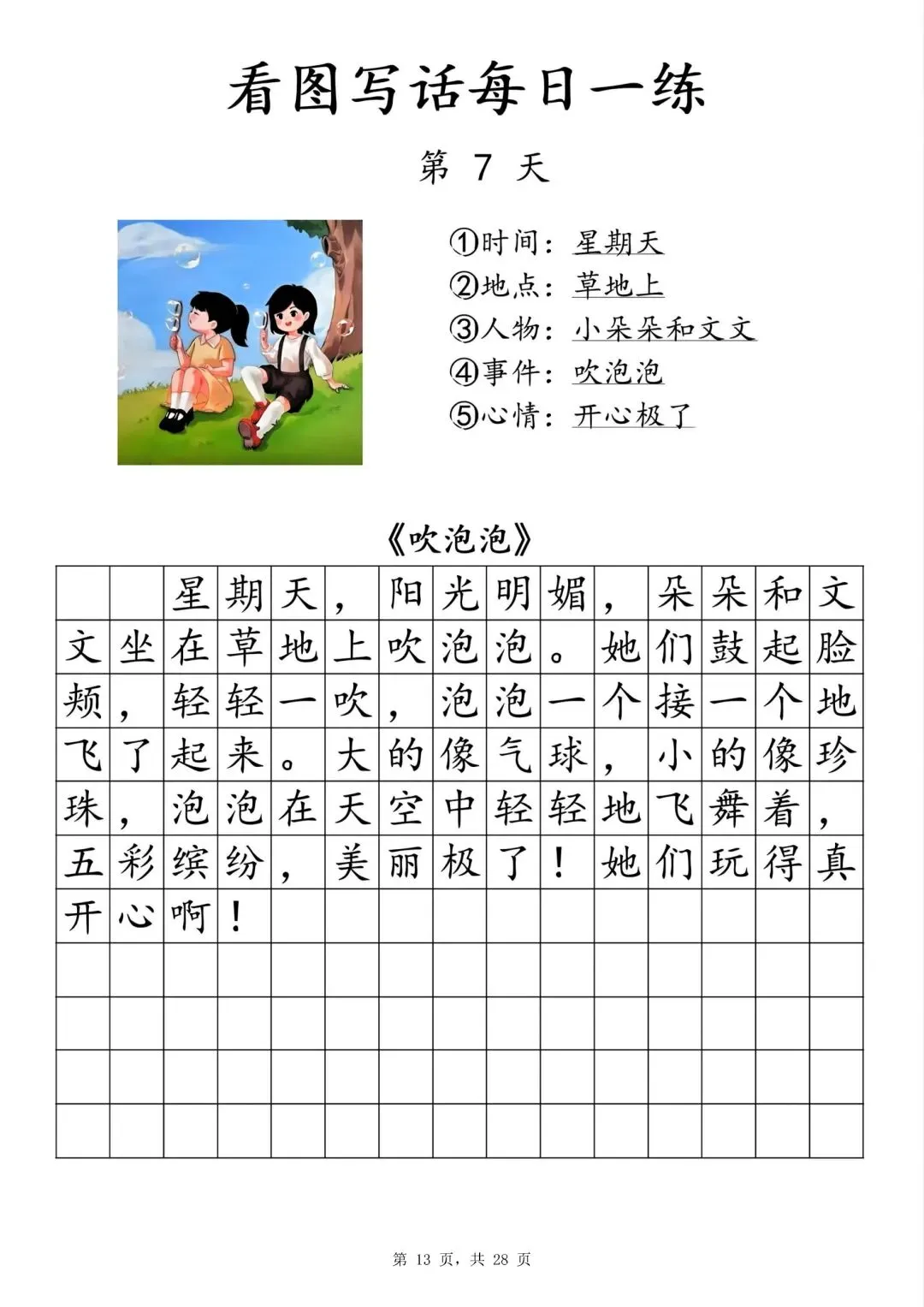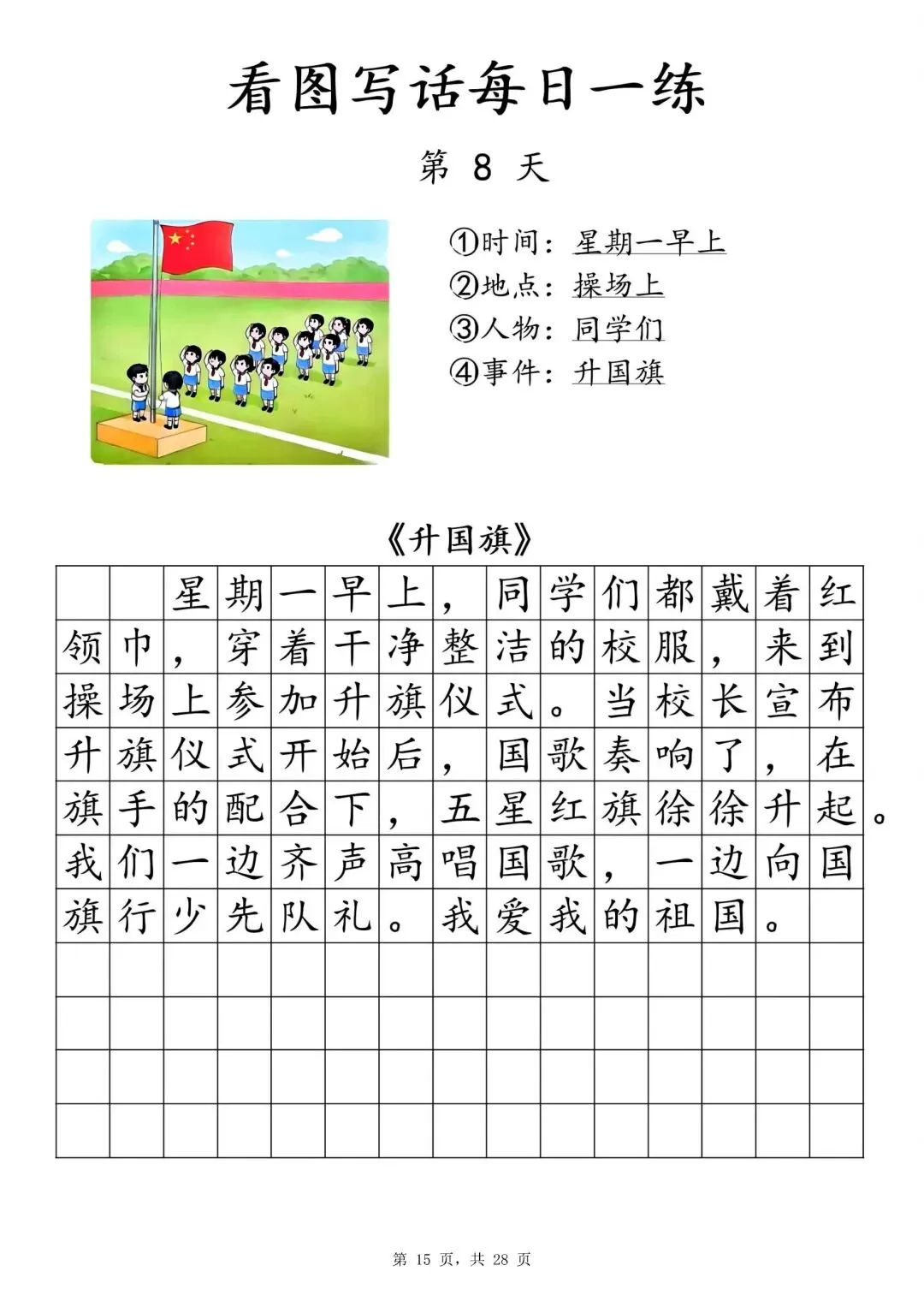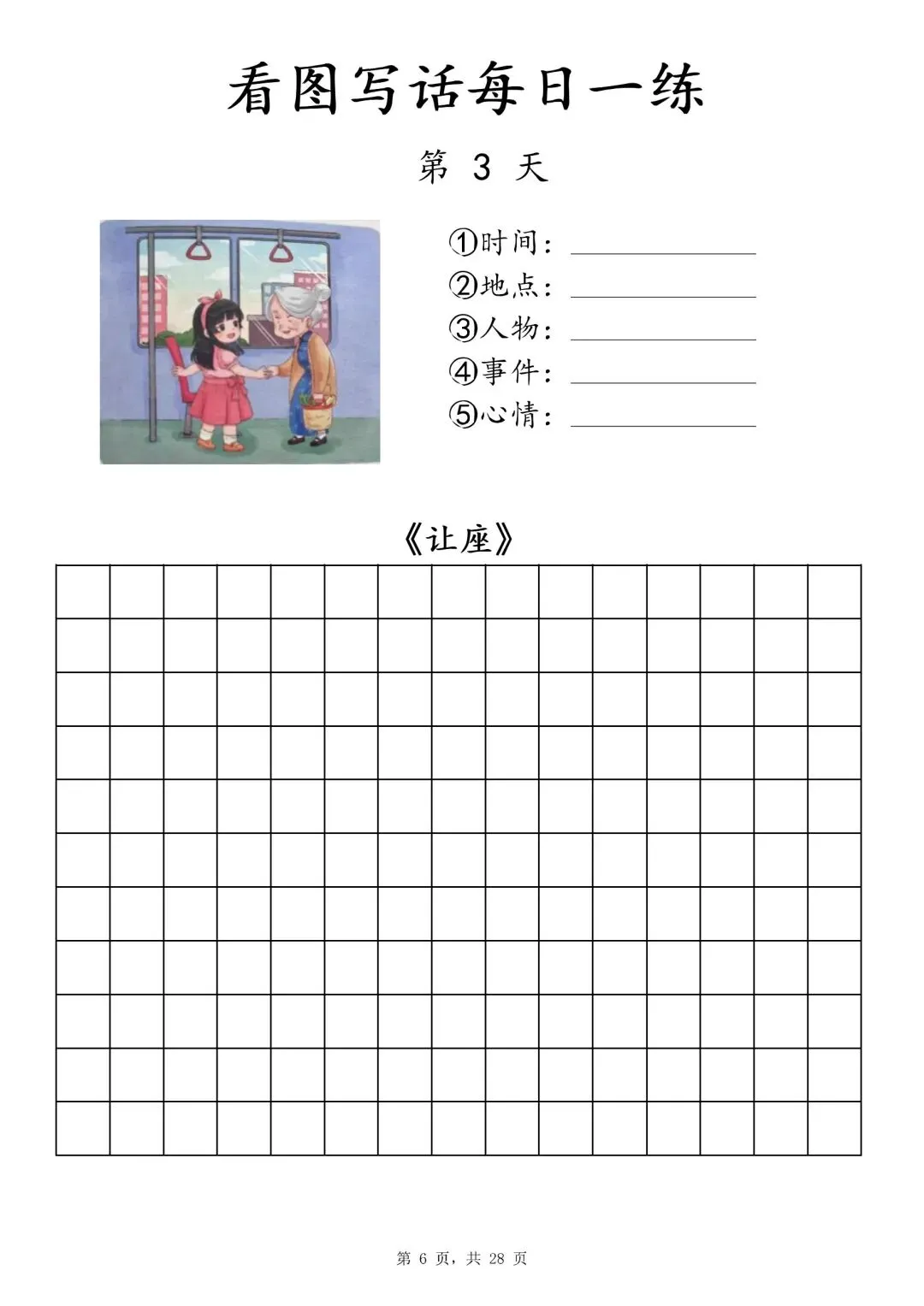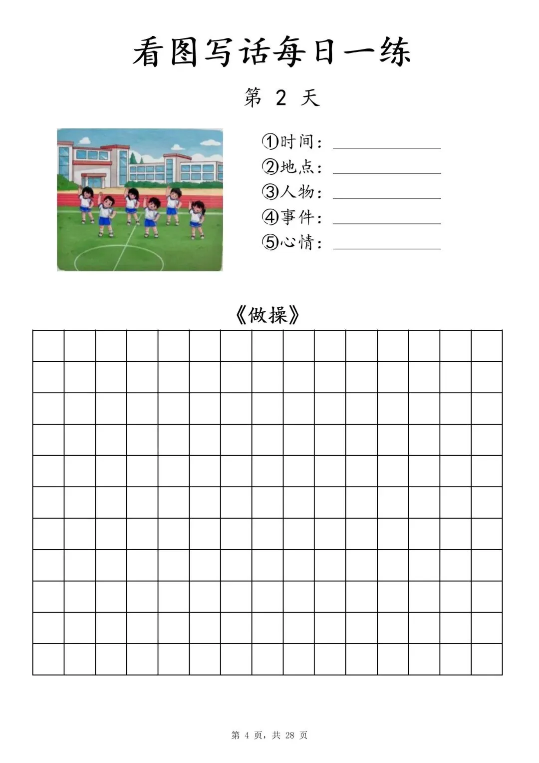 【一年级下册看图写话每日一练】PDF电子版,内容全,29页,包含植树、做操、放风筝、让座等场景,带范文和写作支架,适合一二年级孩子同步练习,提升写作能力~