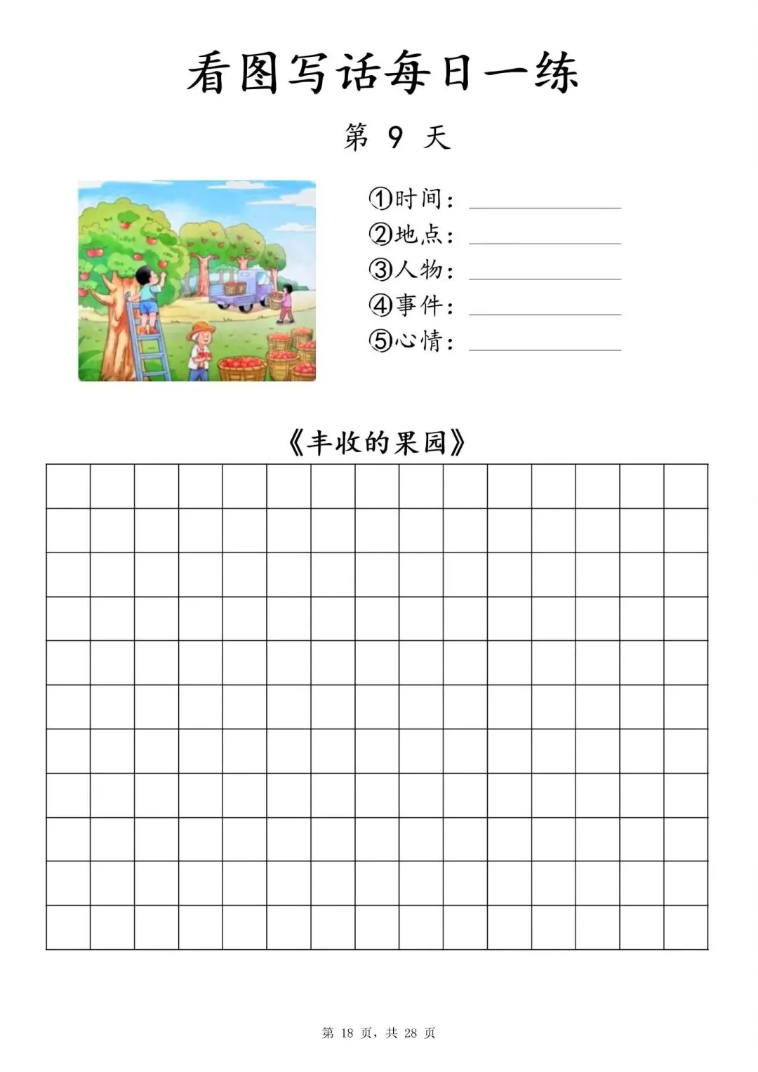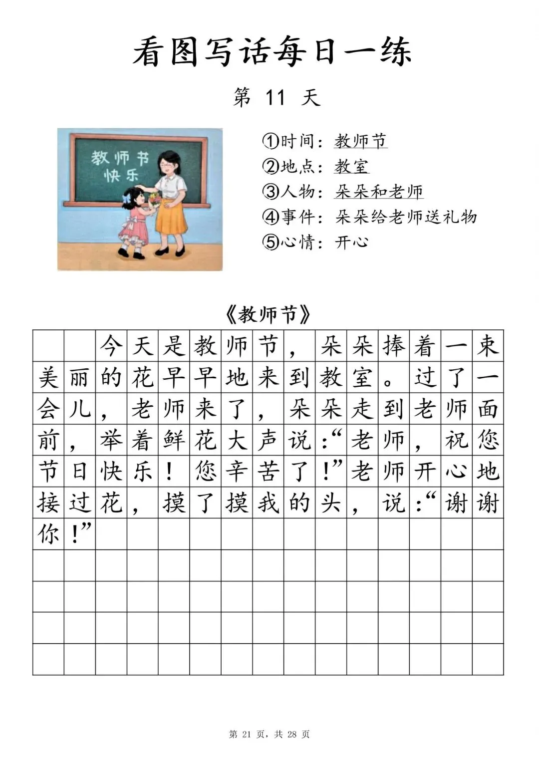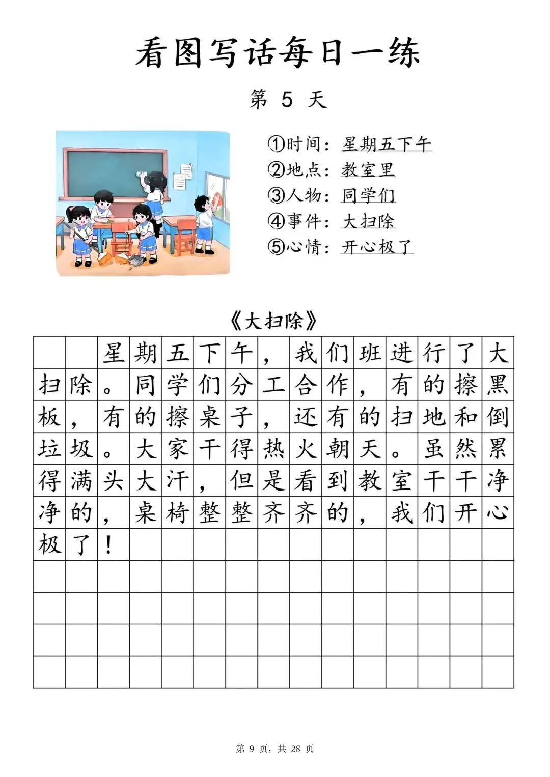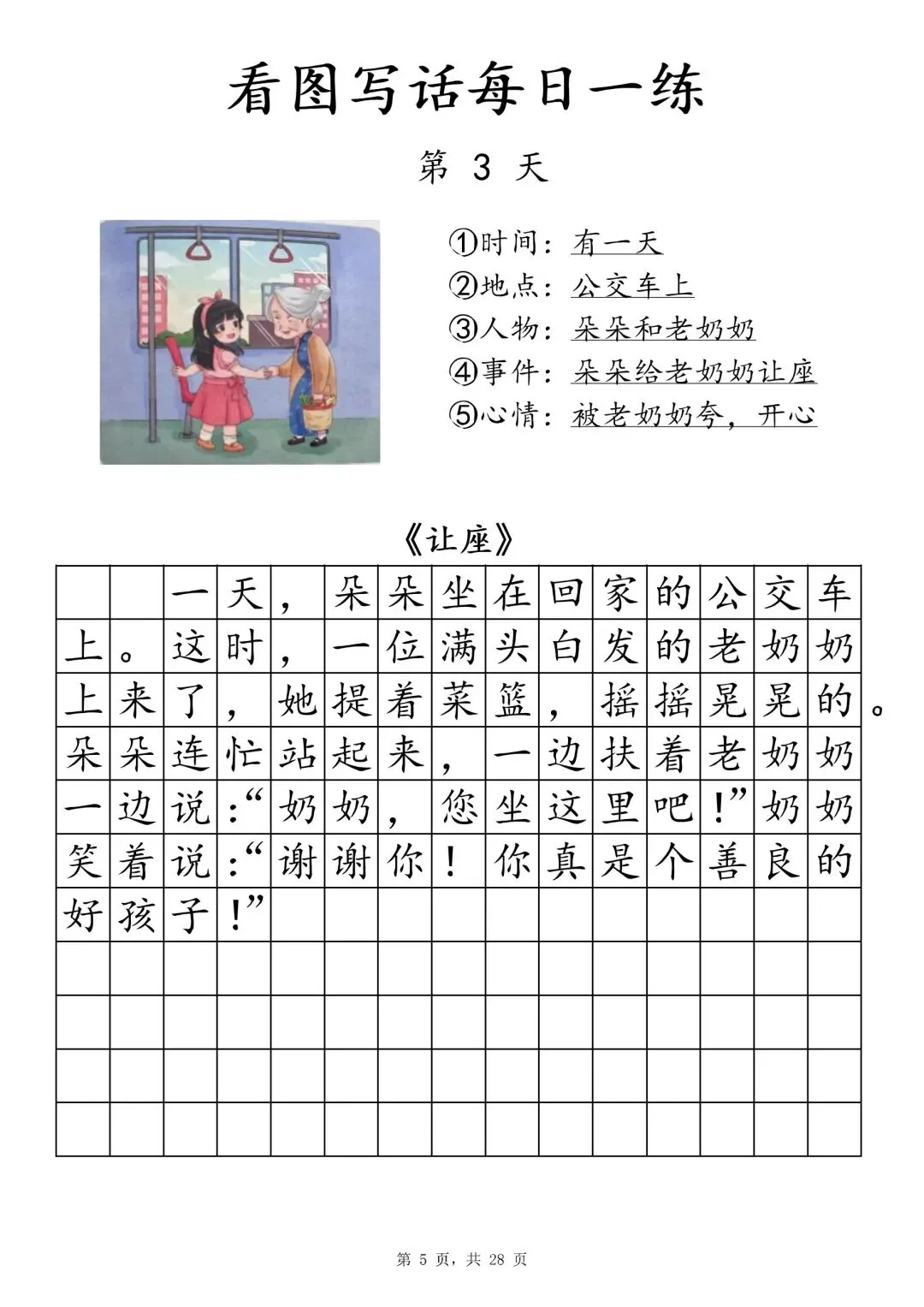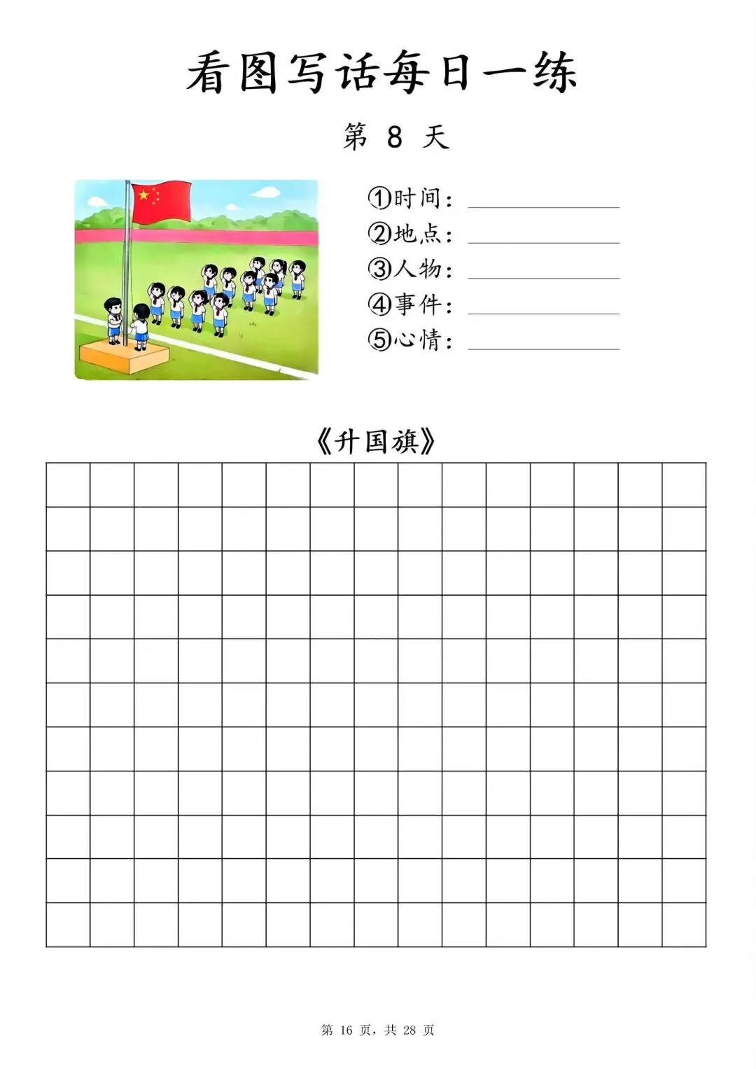 【一年级下册看图写话每日一练】PDF电子版,内容全,29页,包含植树、做操、放风筝、让座等场景,带范文和写作支架,适合一二年级孩子同步练习,提升写作能力~
