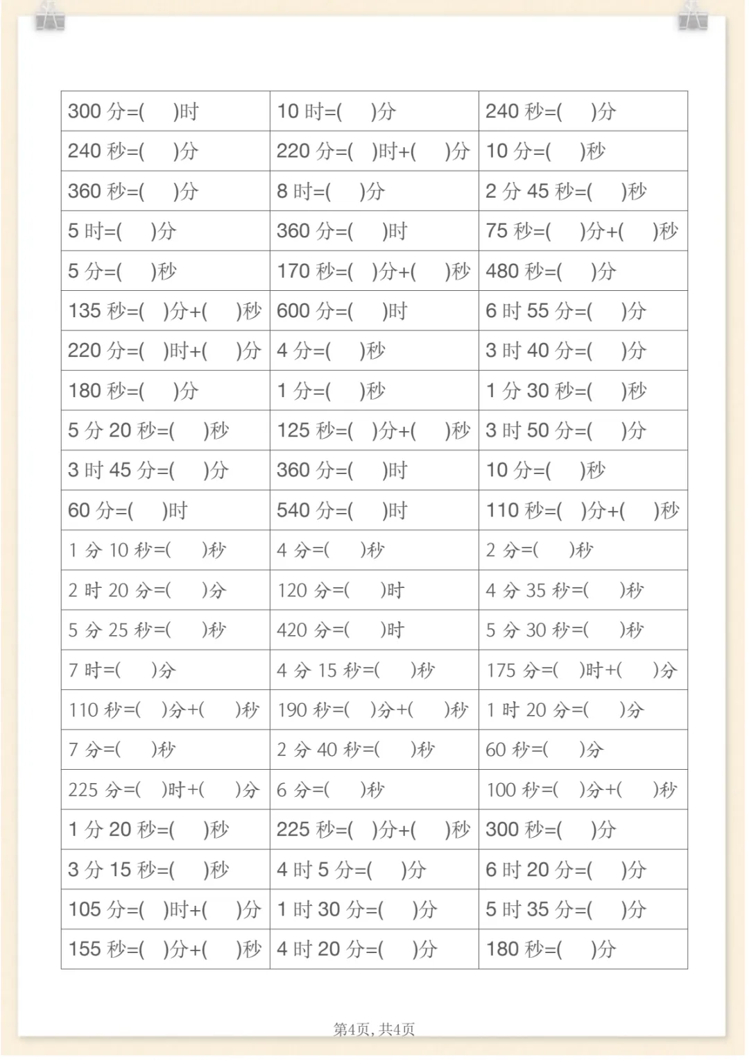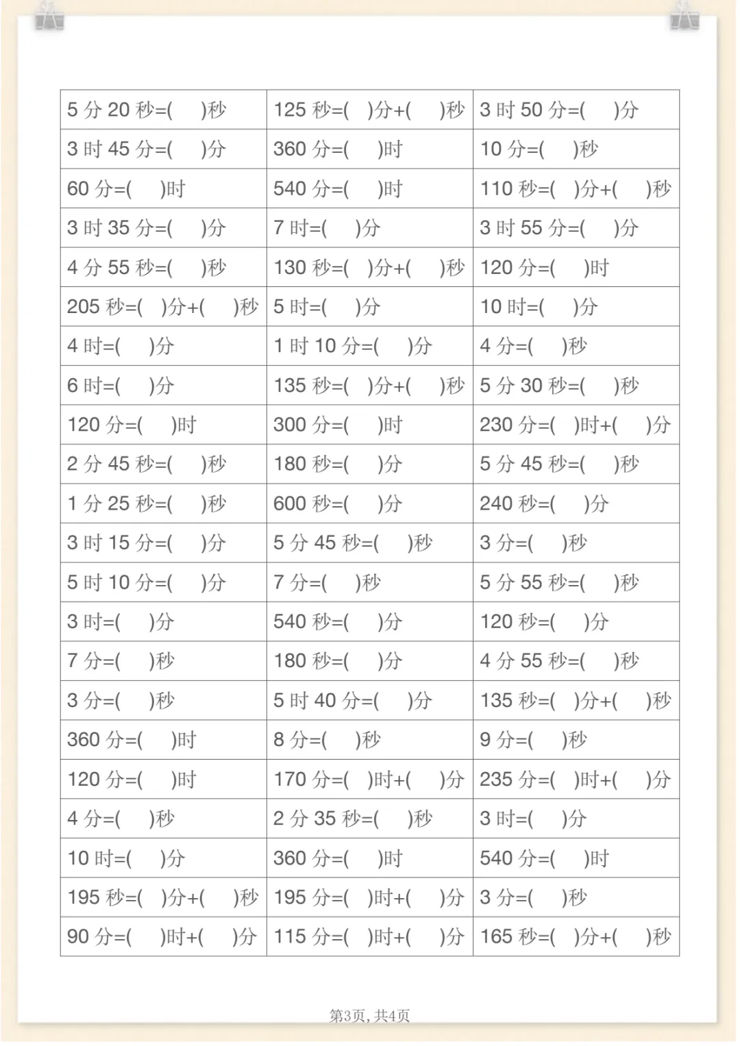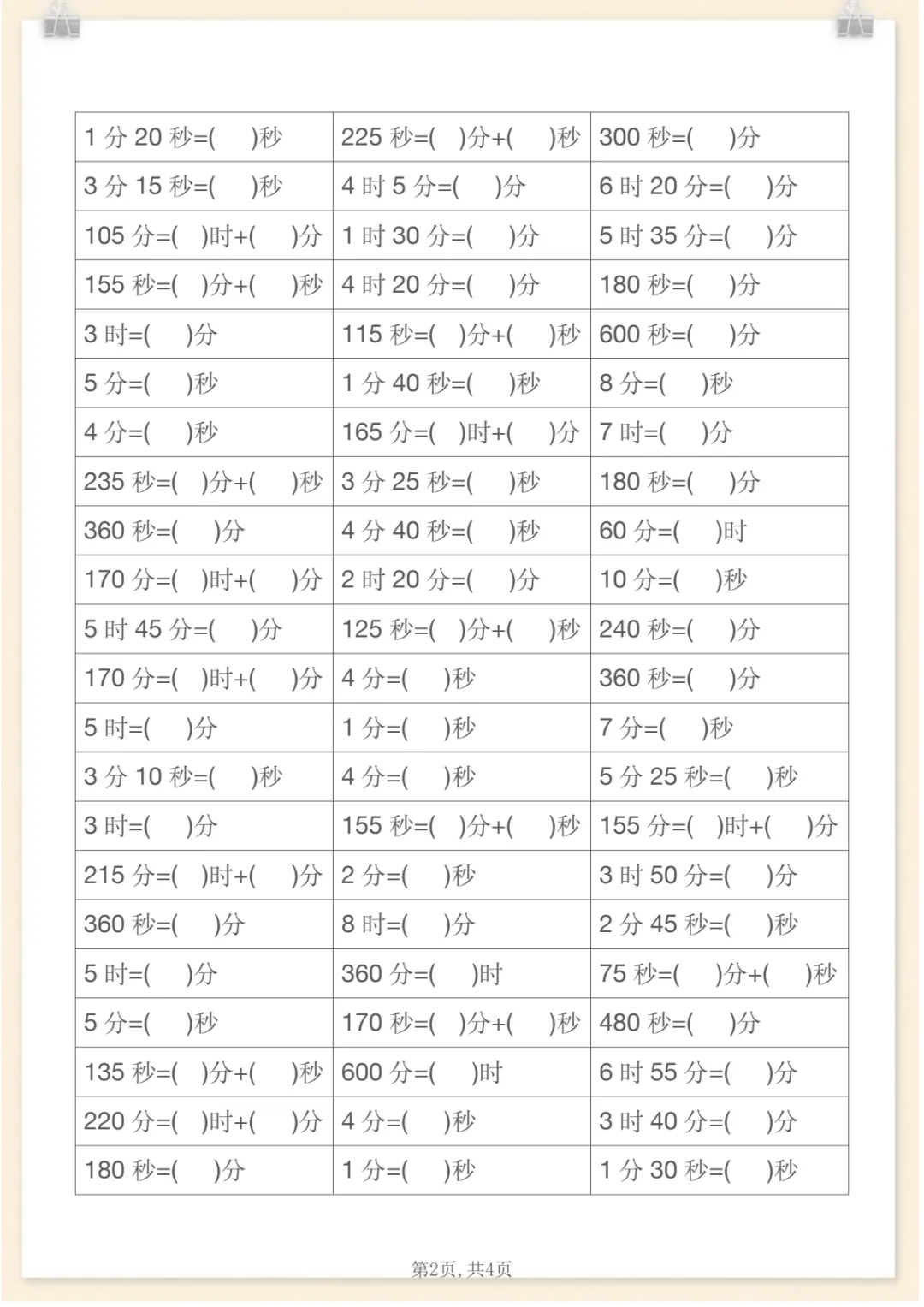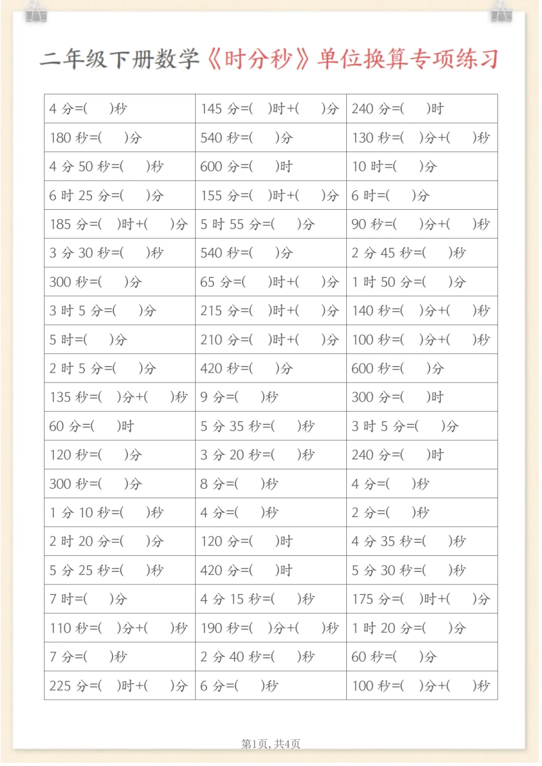 二年级下数学《时分秒》单位换算专项练习,共4页,电子版可下载可打印,这份资料紧扣二年级下册时间知识学习,围绕时、分、秒之间的单位换算与基础应用展开练习,帮助孩子进一步理解时间单位之间的关系,巩固换算方法,提升计算准确率与实际运用能力。内容精炼,适合日常同步训练和课后查漏补缺,需要的家长可以提前保存打印出来,让孩子及时练一练。