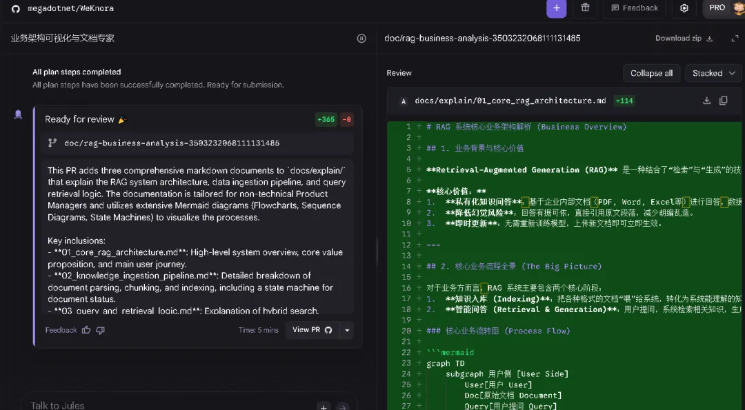1. 授权 GitHub 访问,克隆目标仓库;2. 下达指令生成文档,自动创建 PR 审阅 |