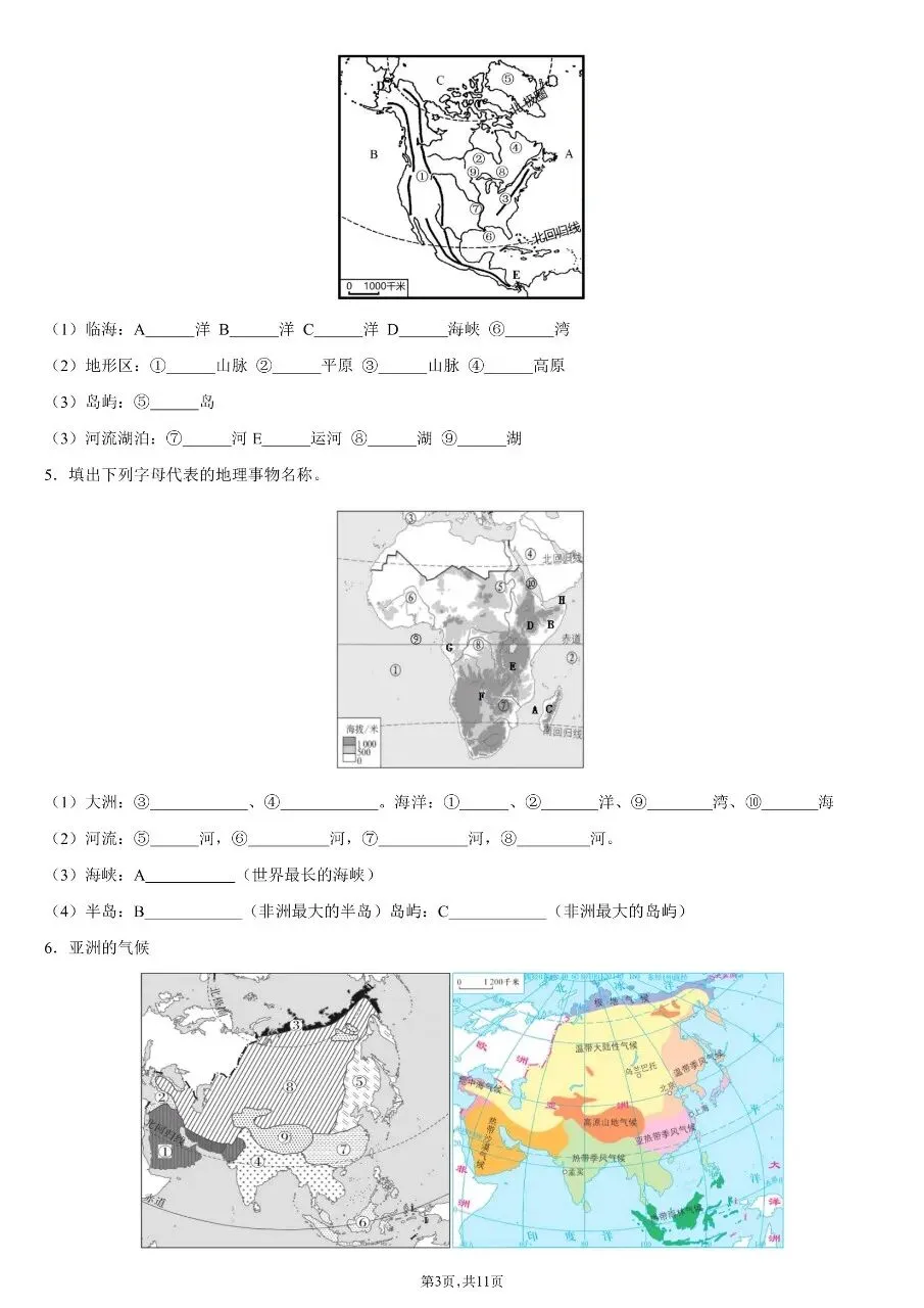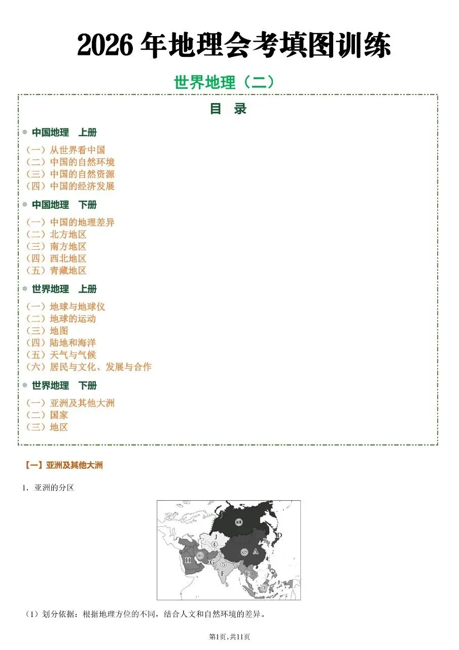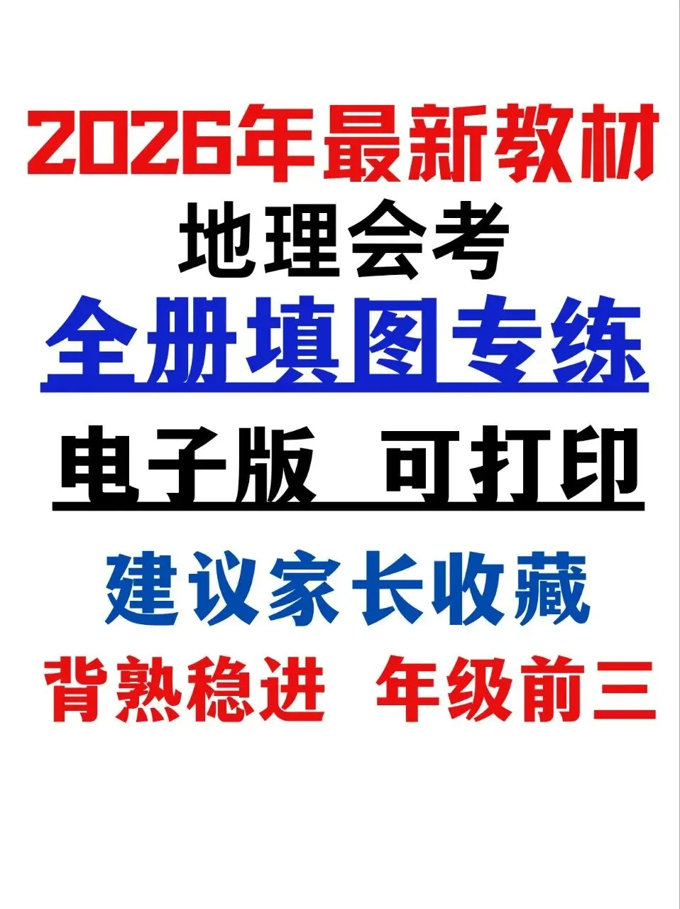 老师专门根据2026年最新会考教材,整理了地理会考全册填图专练,把所有常考地形图、政区图、气候图、交通图、区域图全部汇总到位。每天练一页,边填边记,位置、轮廓、特征一次性吃透,看图就懂、记图就牢。