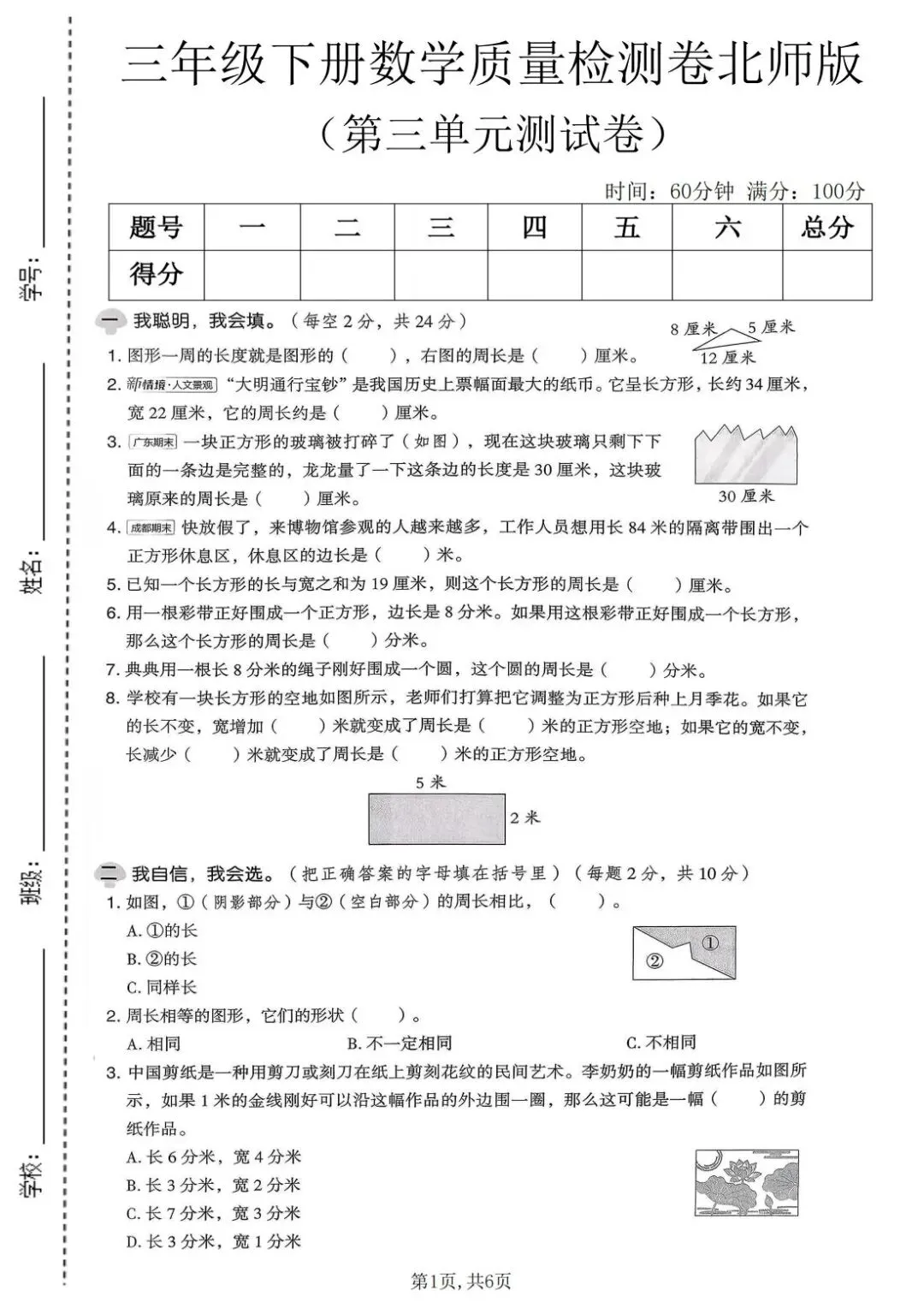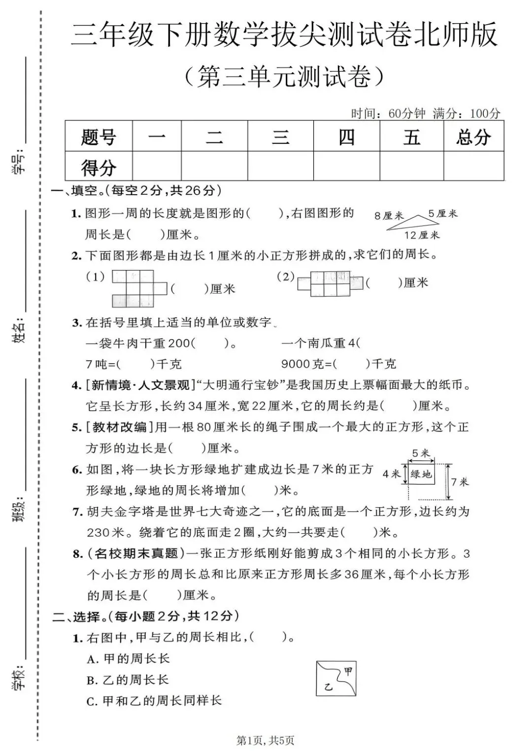 26春北师大版三年级下册数学《第三单元质量测试卷》《乘法》,共3套,含答案,可打印