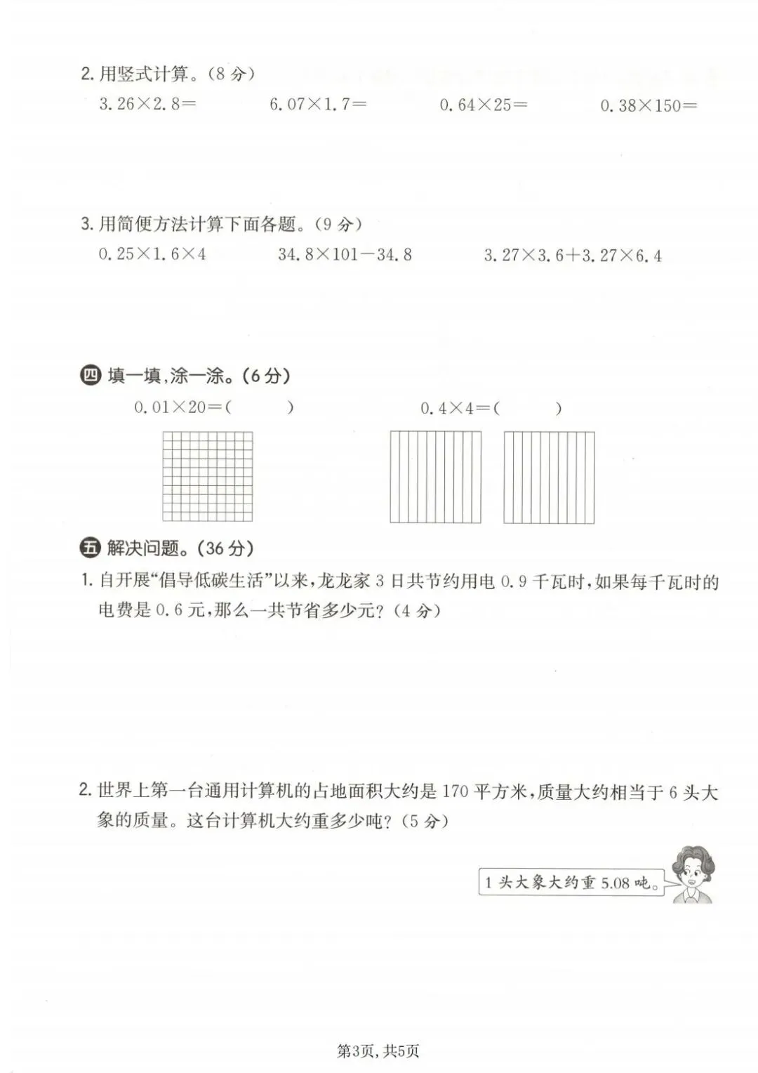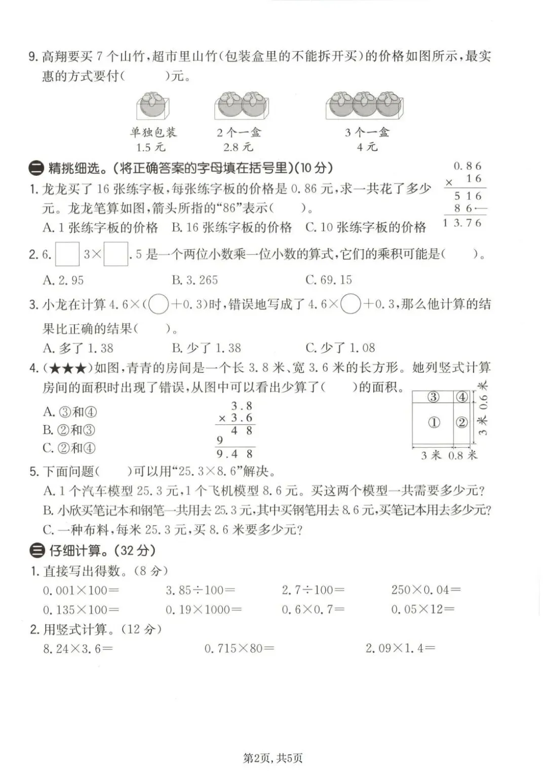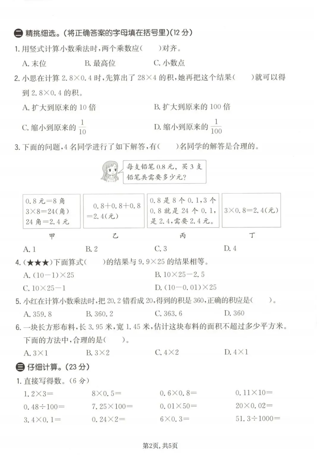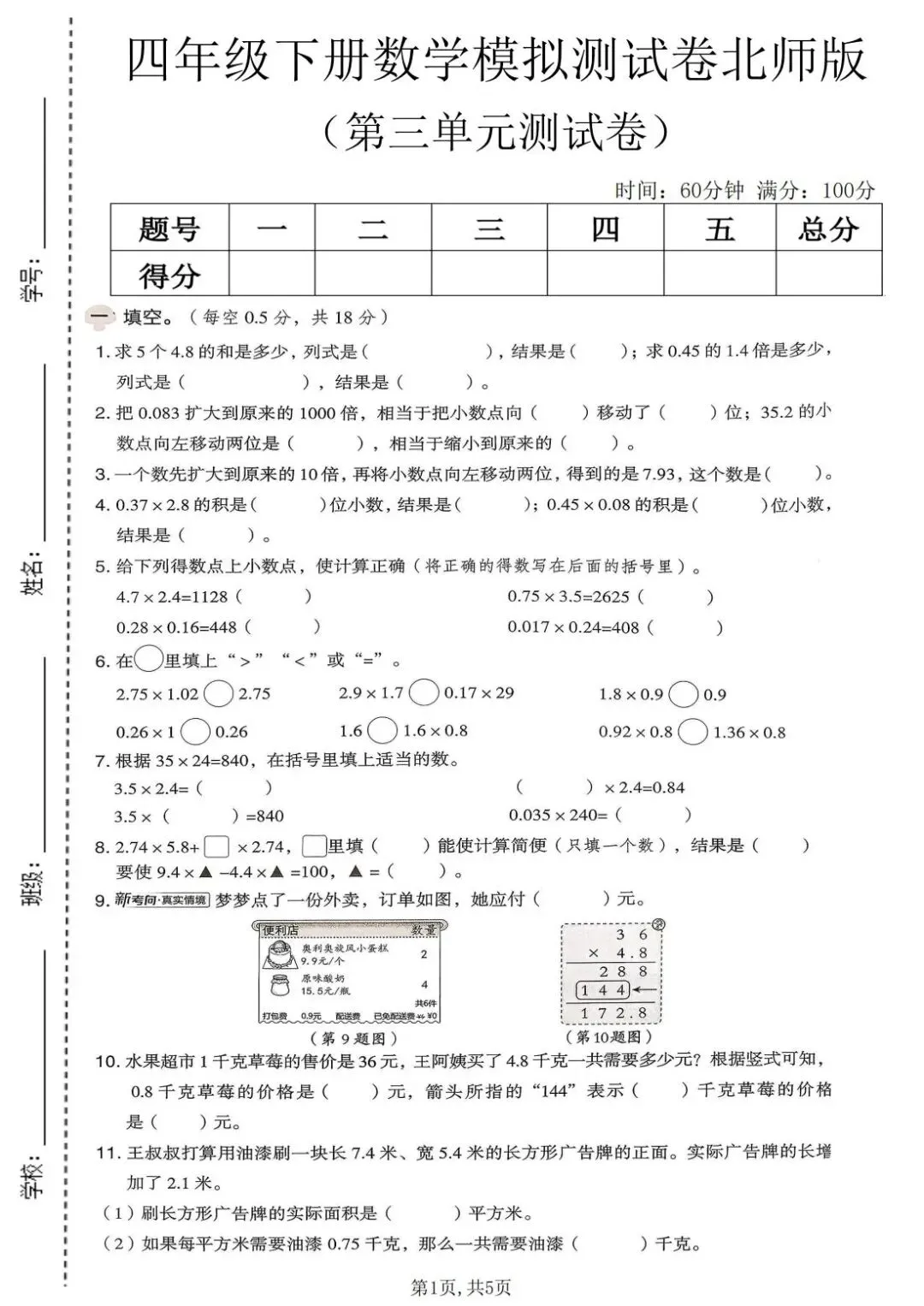 本试卷紧密围绕小数乘法核心,系统考查小数乘整数、小数乘小数的算理与算法。内容设计科学,从基础口算、竖式计算的准确性,到运用积的变化规律、估算解决实际问题,层层递进。尤其注重混合运算、简便计算以及在图形面积、购物付费等真实情境中的应用能力,有效锻炼孩子的数感、运算能力及解决问题的综合思维。