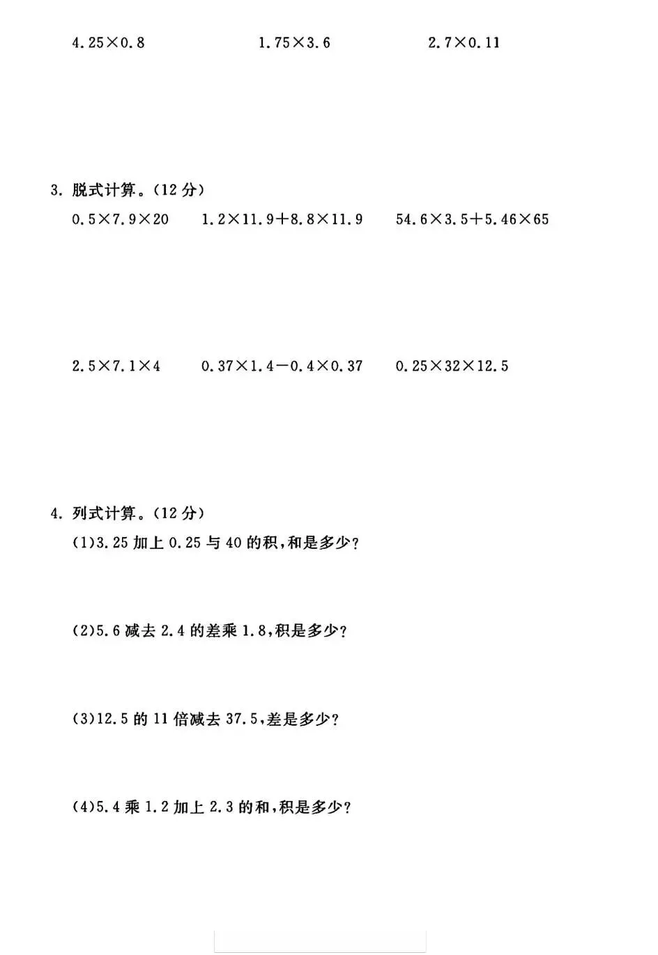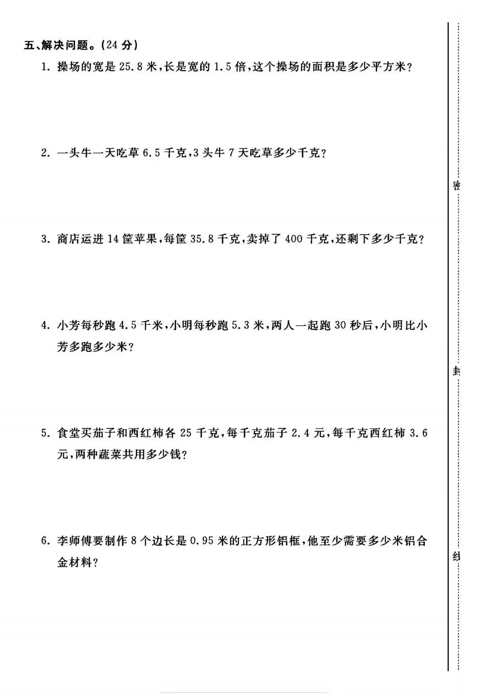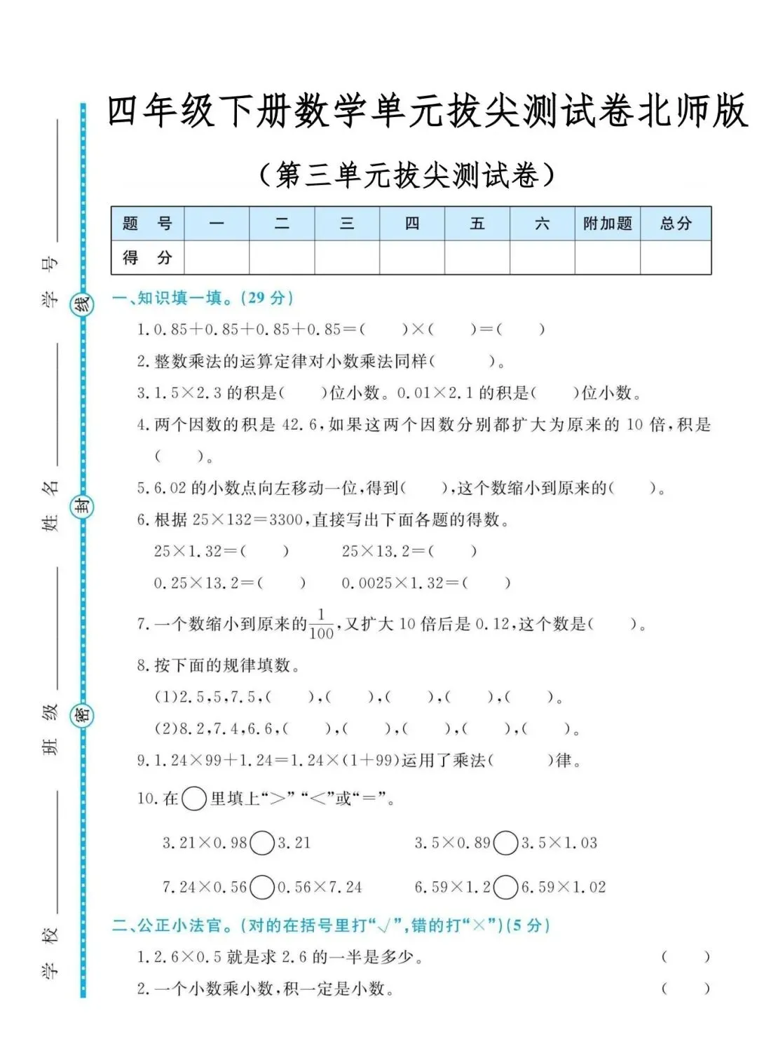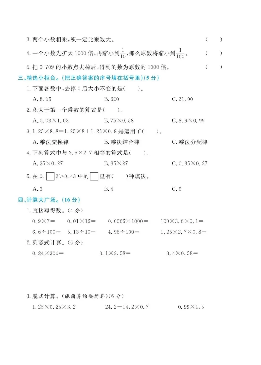 本试卷紧密围绕小数乘法核心,系统考查小数乘整数、小数乘小数的算理与算法。内容设计科学,从基础口算、竖式计算的准确性,到运用积的变化规律、估算解决实际问题,层层递进。尤其注重混合运算、简便计算以及在图形面积、购物付费等真实情境中的应用能力,有效锻炼孩子的数感、运算能力及解决问题的综合思维。
