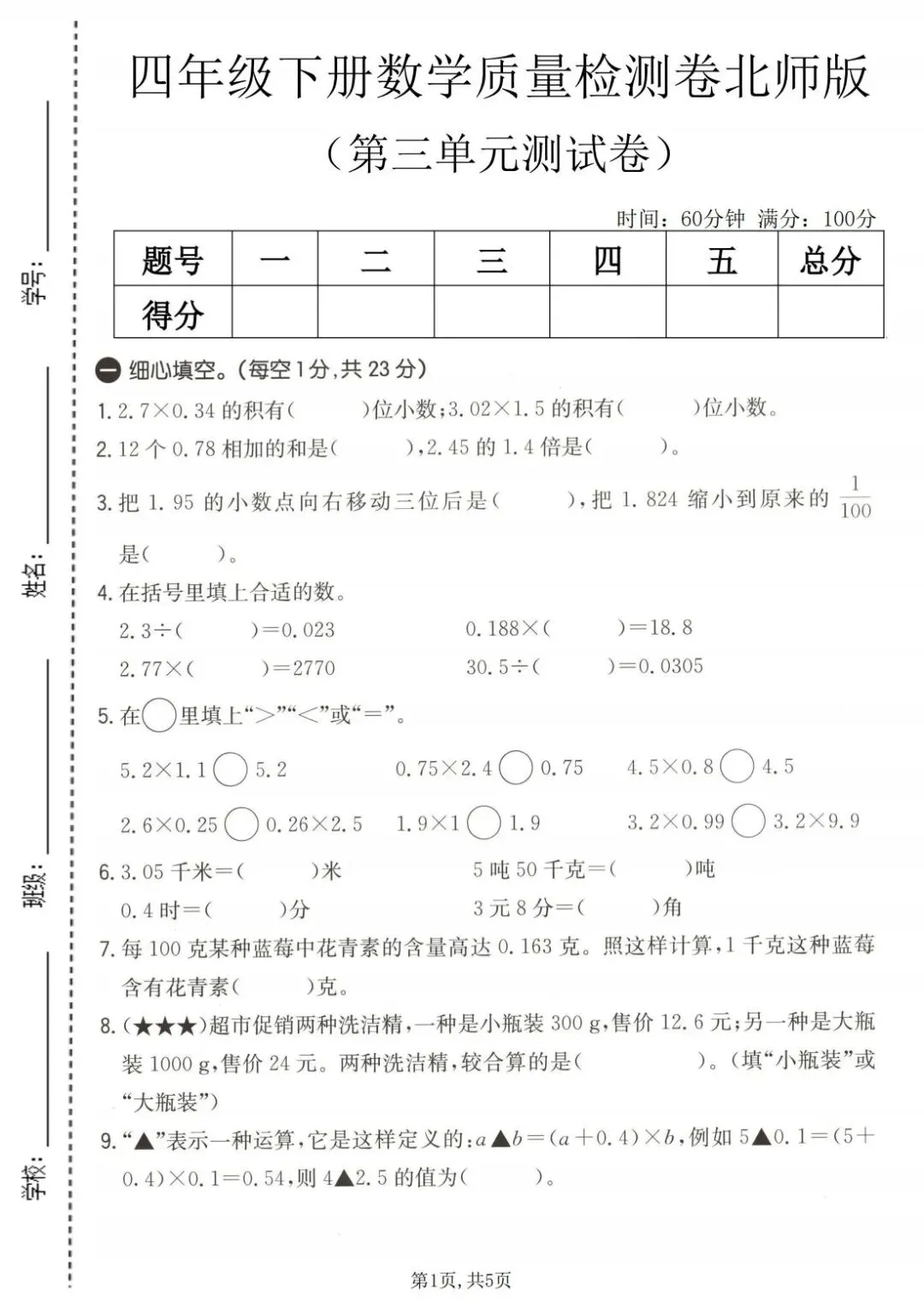 26春北师大版四年级下册数学《第三单元质量测试卷》《小数乘法》,共5套,含答案,可打印
