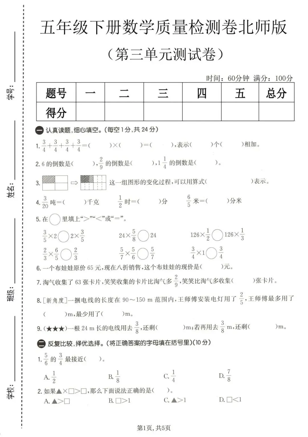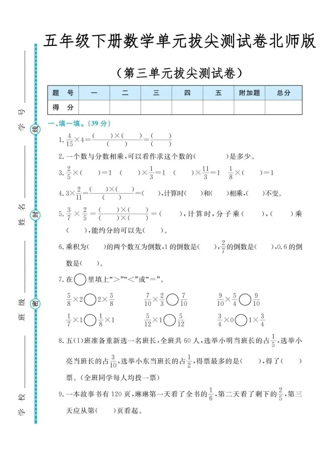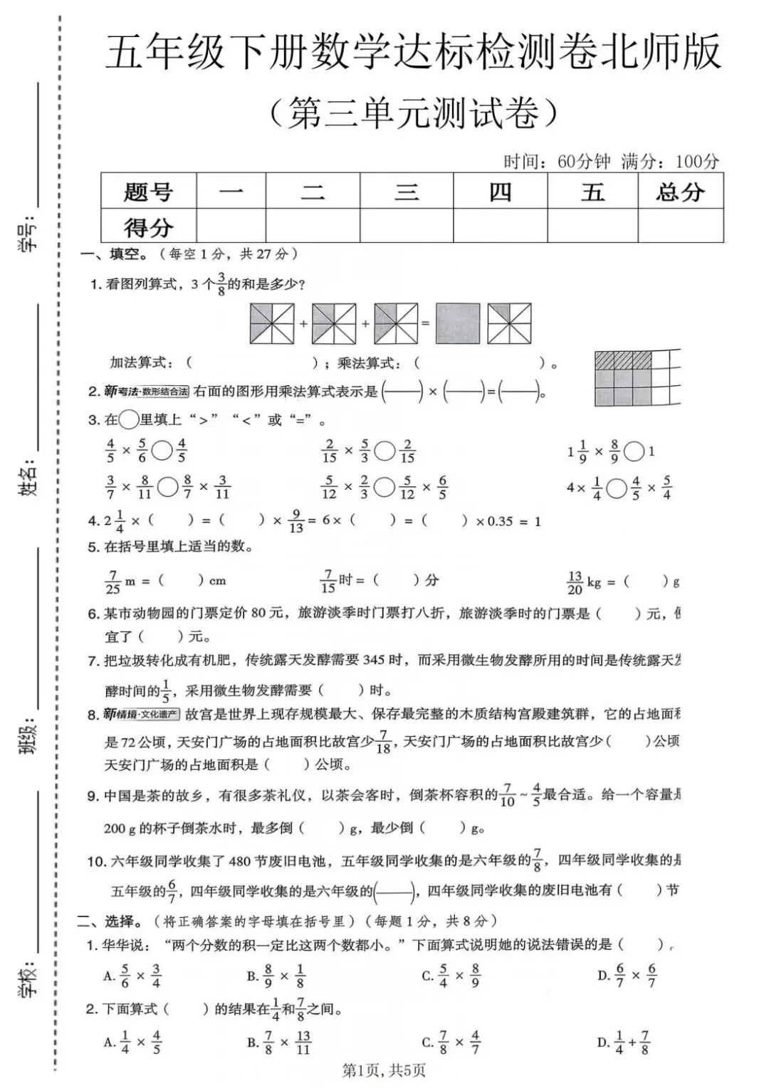 五年级数学的分水岭已至,分数乘法的掌握程度直接影响后续学习!这份北师大版五年级下册数学《第三单元质量测试卷》,专为检测与巩固本单元核心能力设计。