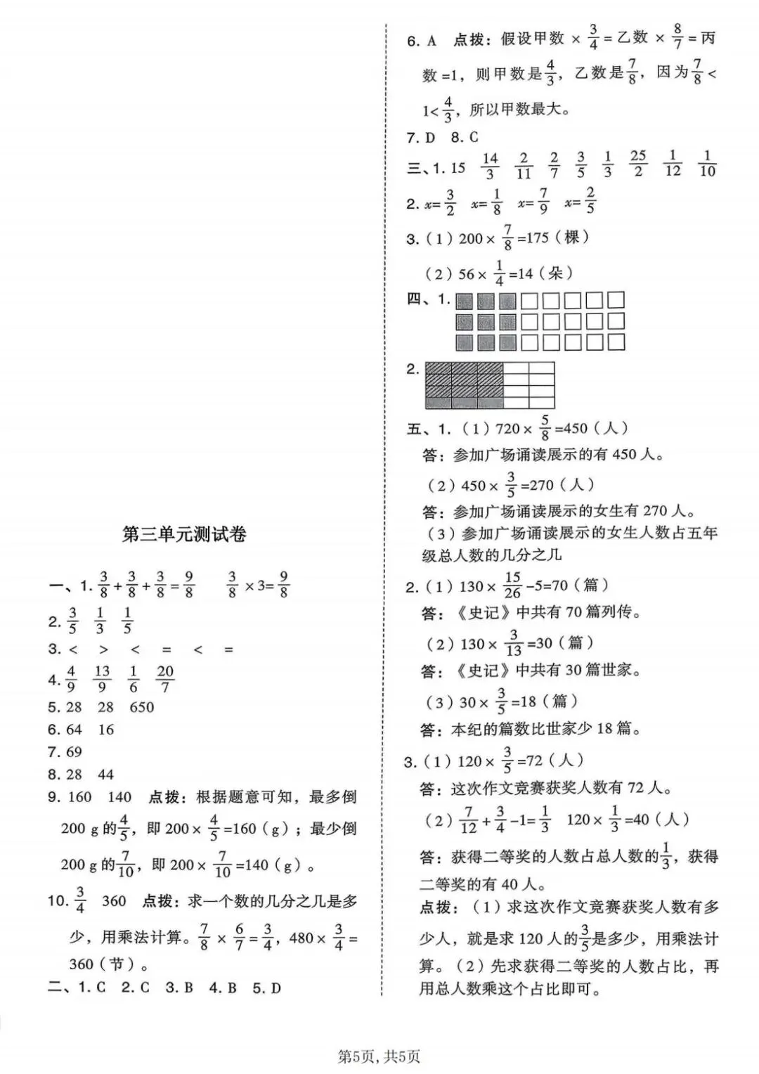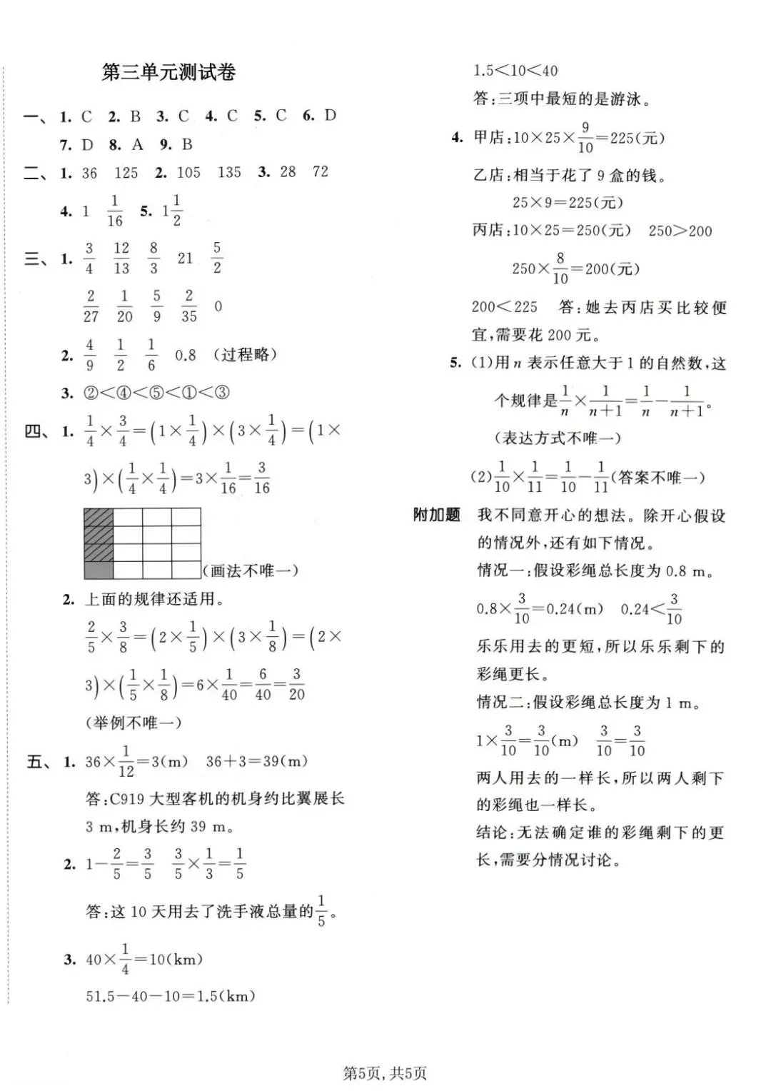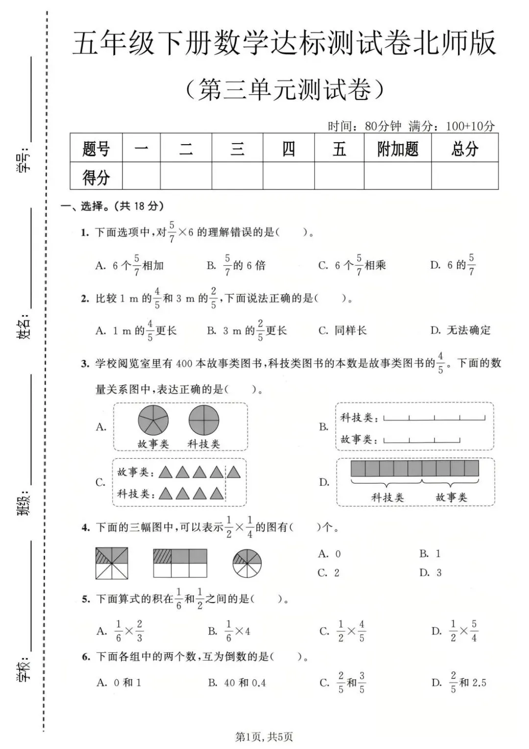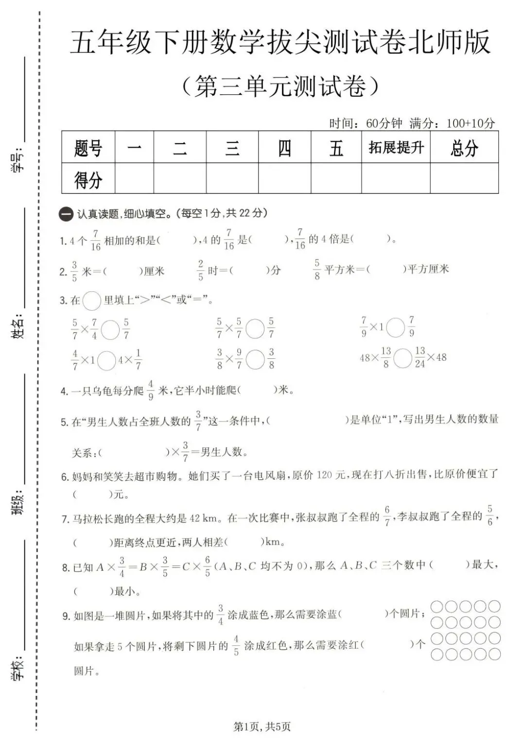 五年级数学的分水岭已至,分数乘法的掌握程度直接影响后续学习!这份北师大版五年级下册数学《第三单元质量测试卷》,专为检测与巩固本单元核心能力设计。