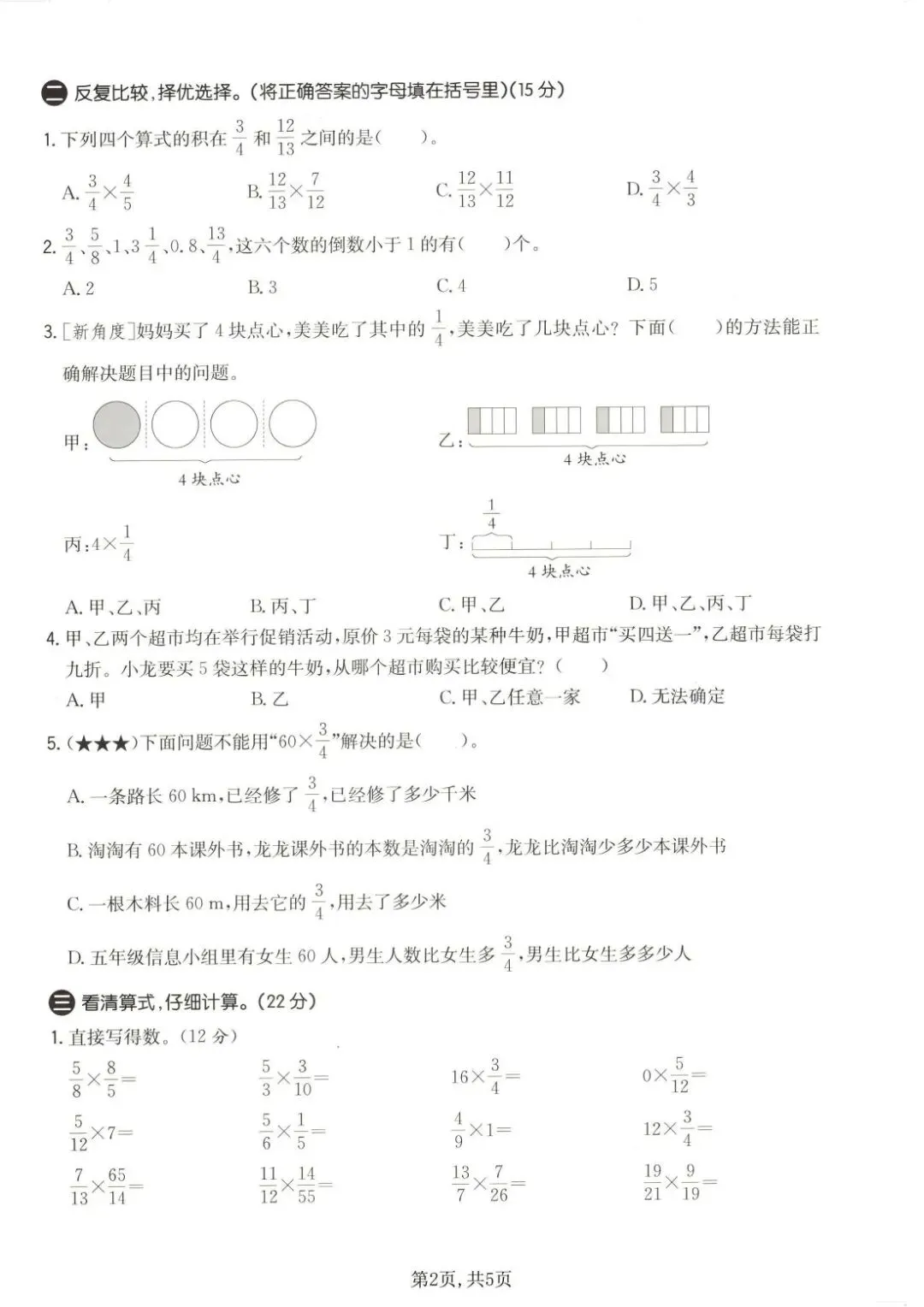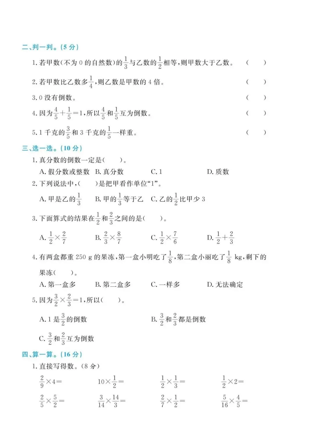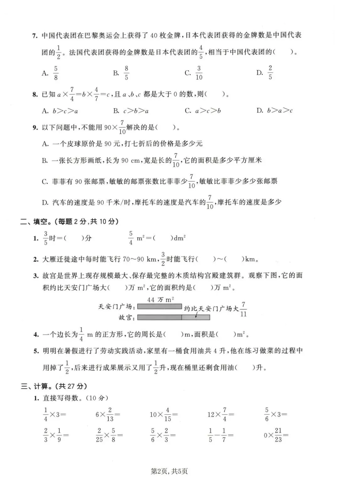 本试卷全面覆盖分数乘法所有重难点:从分数乘整数、分数乘分数的计算法则与算理理解,到解决“求一个数的几分之几是多少”的经典实际问题。题型丰富,既考查倒数概念、简便运算等基础知识,更侧重在购物折扣、面积计算、复杂应用题等真实情境中灵活运用知识的能力,有效区分学生的计算熟练度与数学建模水平。