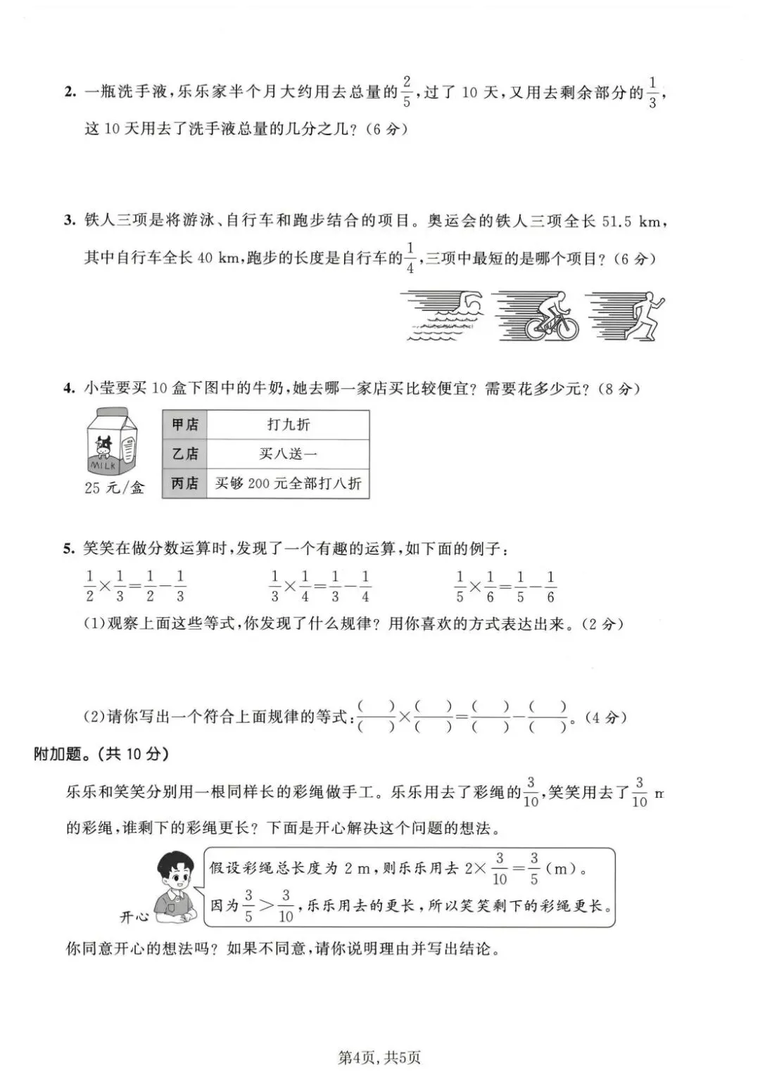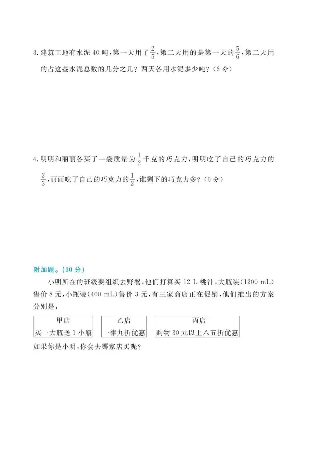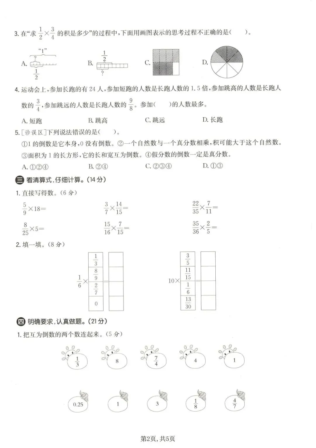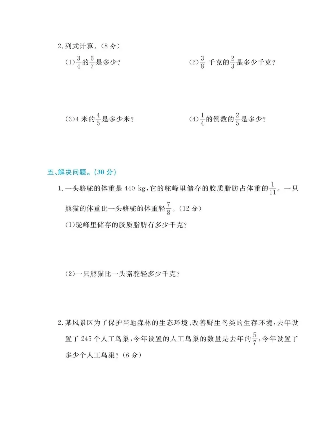 本试卷全面覆盖分数乘法所有重难点:从分数乘整数、分数乘分数的计算法则与算理理解,到解决“求一个数的几分之几是多少”的经典实际问题。题型丰富,既考查倒数概念、简便运算等基础知识,更侧重在购物折扣、面积计算、复杂应用题等真实情境中灵活运用知识的能力,有效区分学生的计算熟练度与数学建模水平。