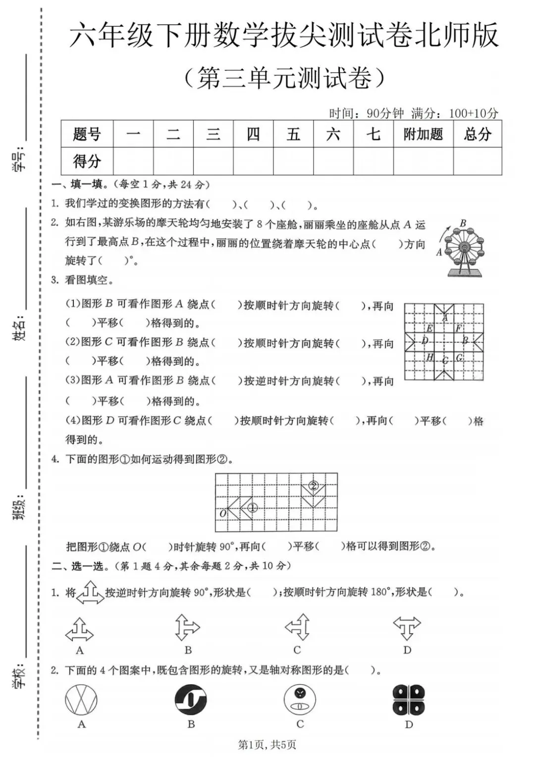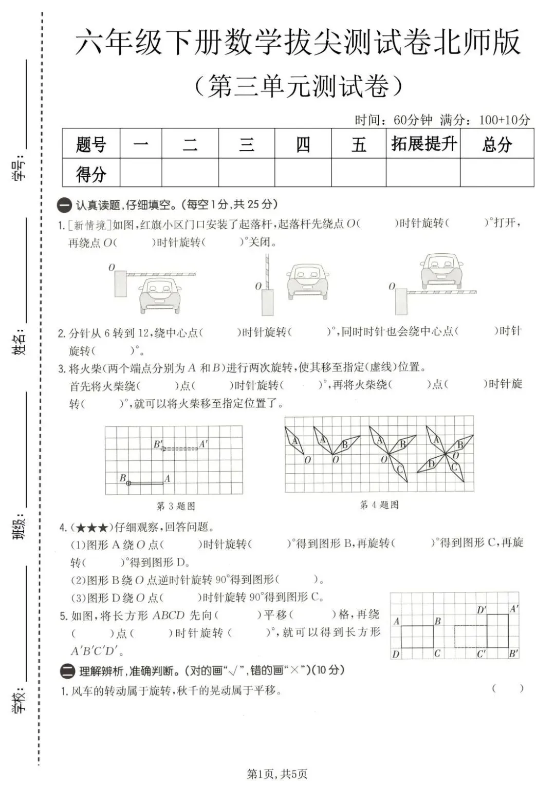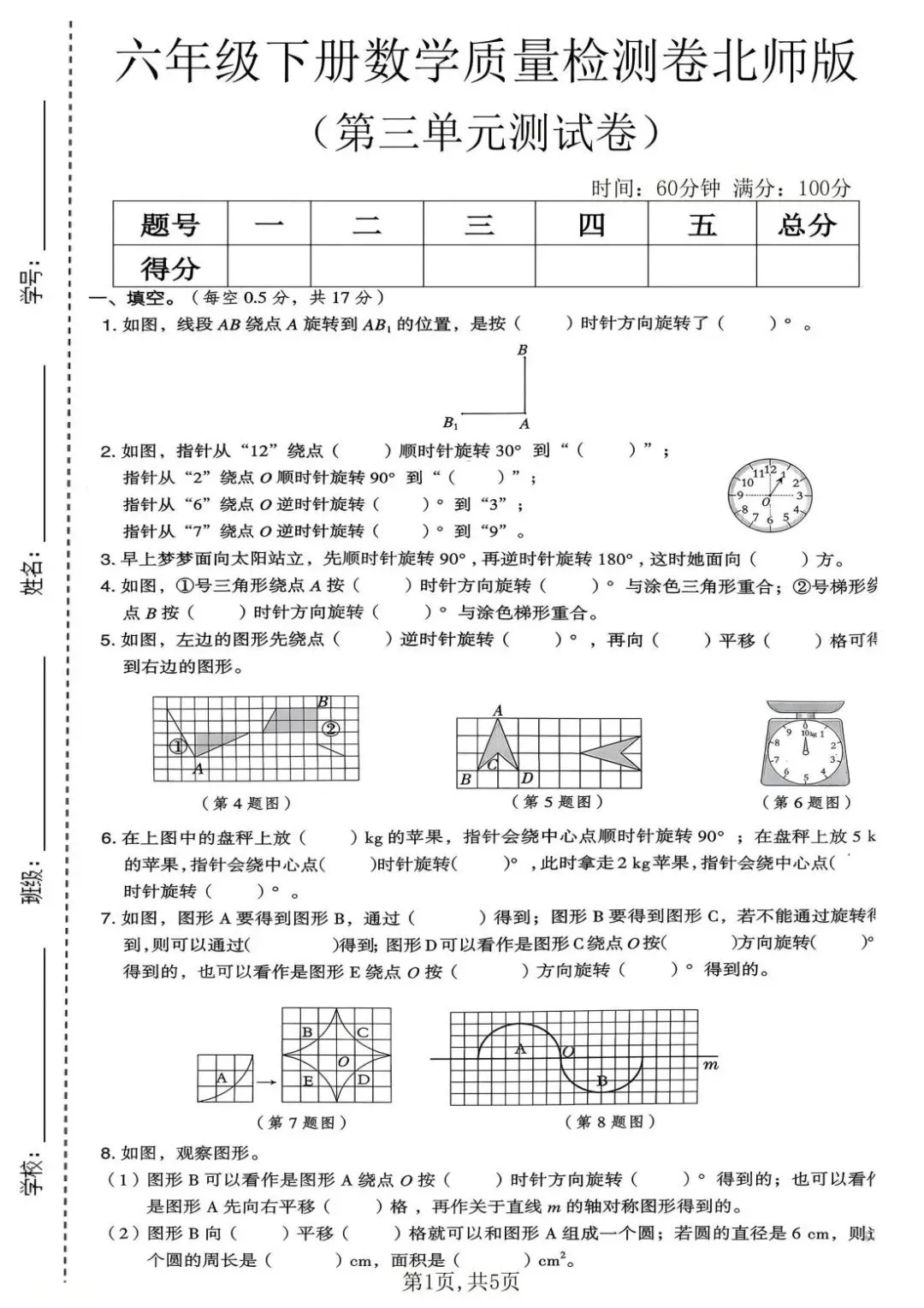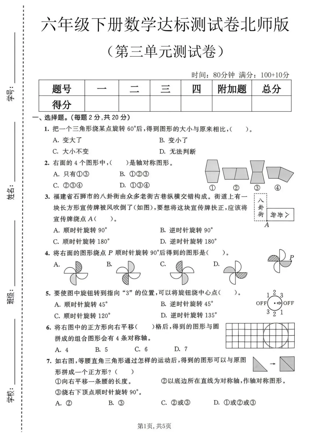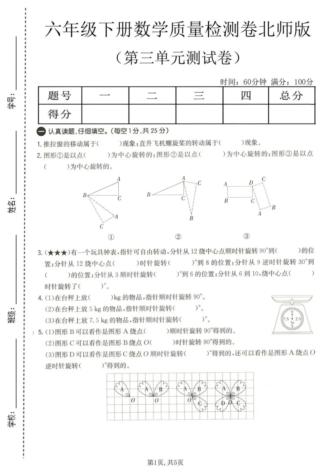 小升初复习进入关键期,图形的变换能力是空间思维的核心考查点!这份北师大版六年级下册数学《第三单元质量测试卷》,精准聚焦图形的运动这一重要几何板块,助力学生系统过关。