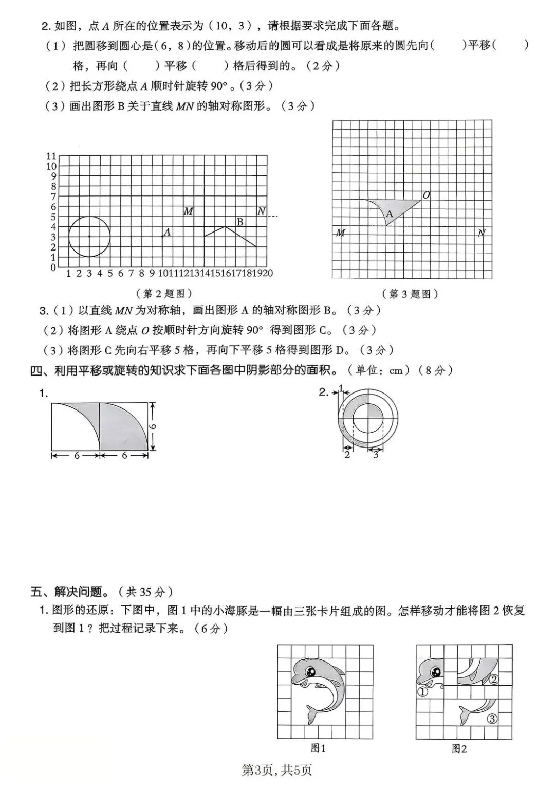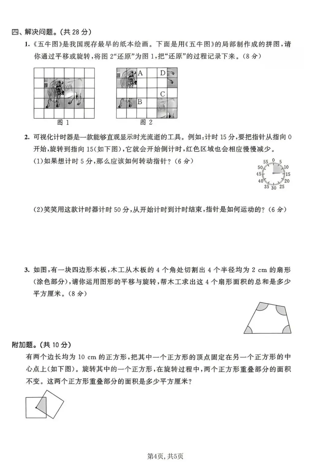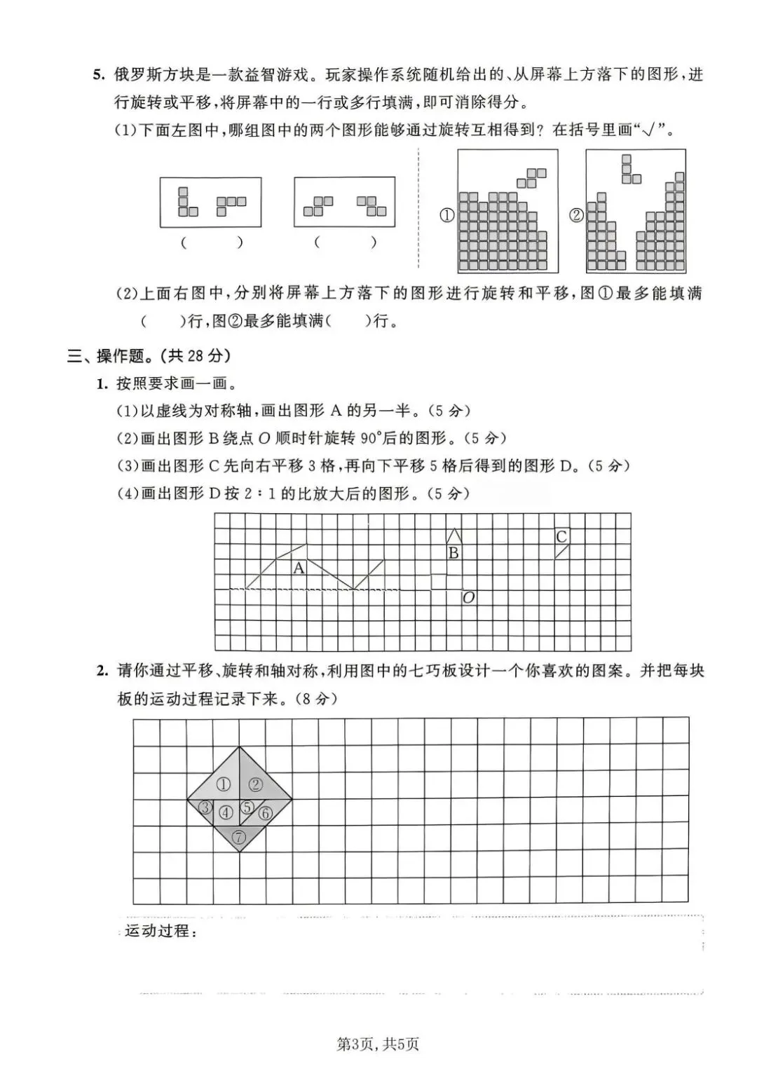 本试卷深入考查图形旋转、平移、放大与缩小(图形的运动) 三大核心内容。不仅要求学生准确描述运动过程、画出变换后的图形,更注重在方格纸上的实际操作与想象能力。试题紧密联系对称、比例等知识,通过设计图案、解决实际问题等题型,综合评估学生的空间观念、动手能力与几何应用水平。