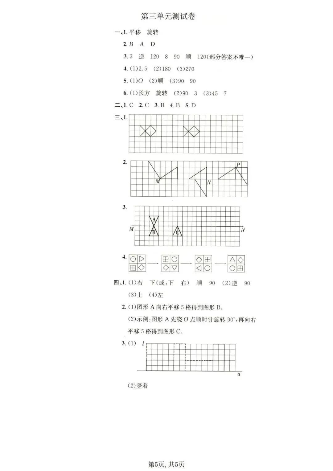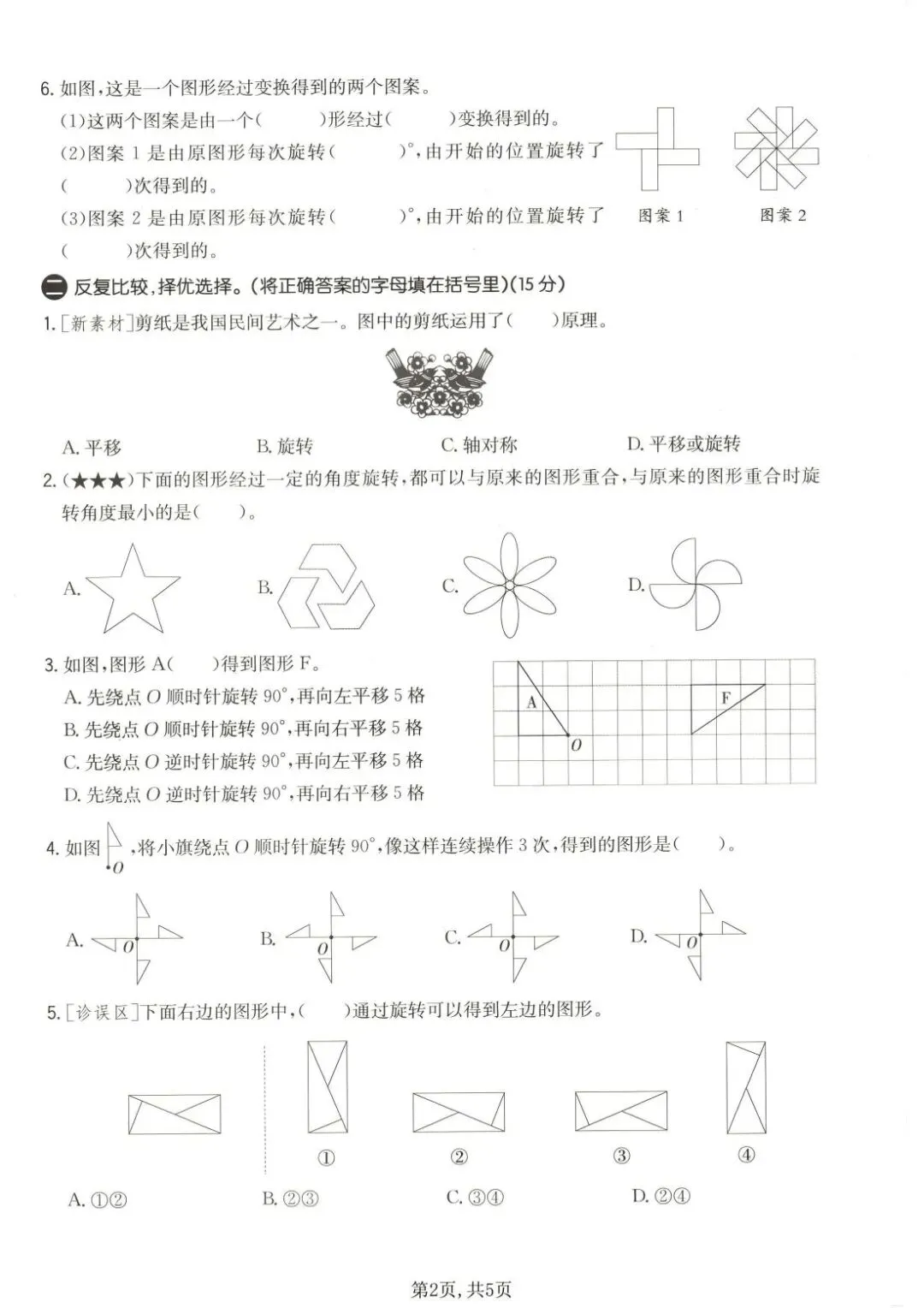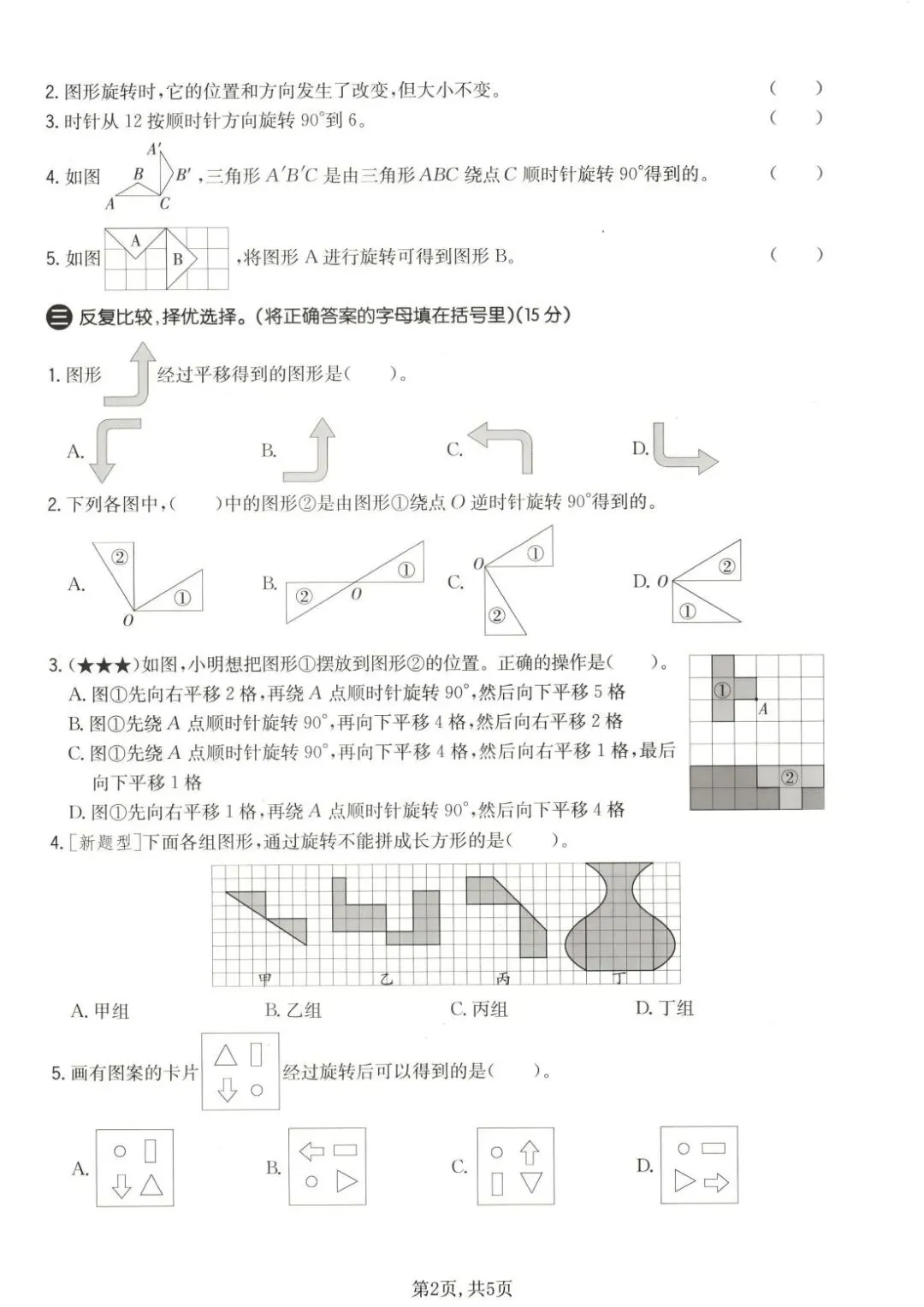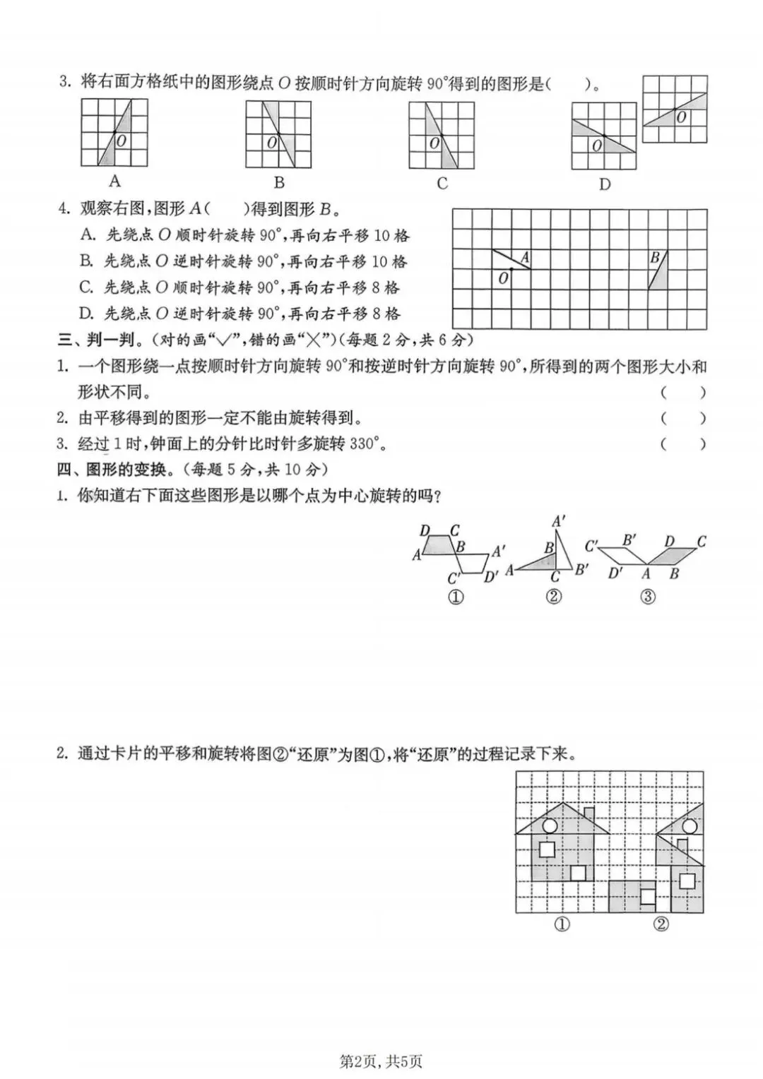 本试卷深入考查图形旋转、平移、放大与缩小(图形的运动) 三大核心内容。不仅要求学生准确描述运动过程、画出变换后的图形,更注重在方格纸上的实际操作与想象能力。试题紧密联系对称、比例等知识,通过设计图案、解决实际问题等题型,综合评估学生的空间观念、动手能力与几何应用水平。