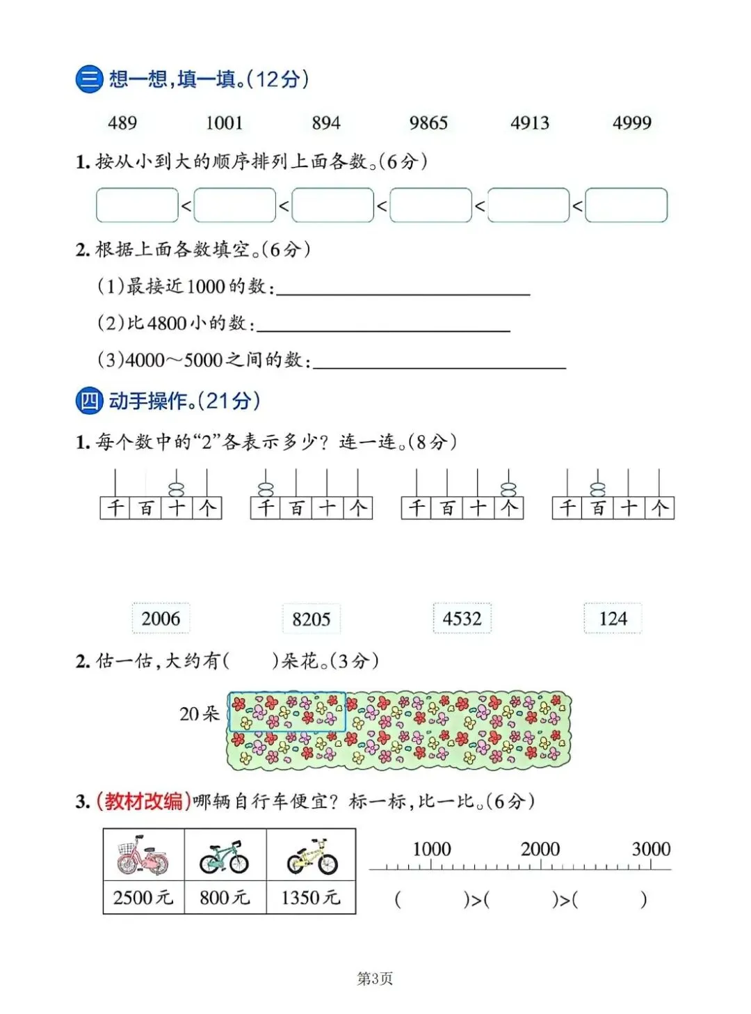 试卷结构清晰,题型丰富。基础部分着重数的组成与位值概念辨析;重点部分强化数的读写、比较与排序;应用部分则巧妙融入估算与简单实际问题,引导学生将抽象的大数与具体生活场景(如场馆人数、商品价格)建立联系,考查其数感与应用能力。