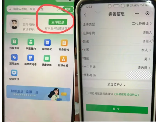 2、注册:使用签约居民手机号开始注册。填写签约时姓名、身份证号码及手机号。