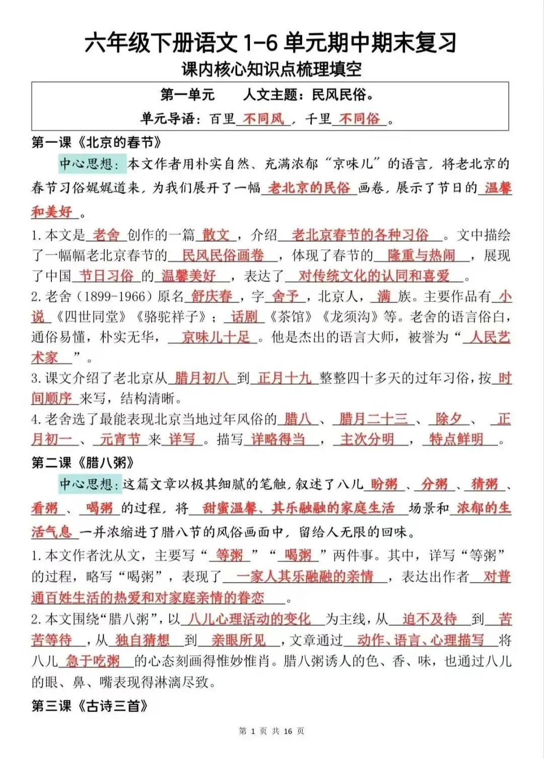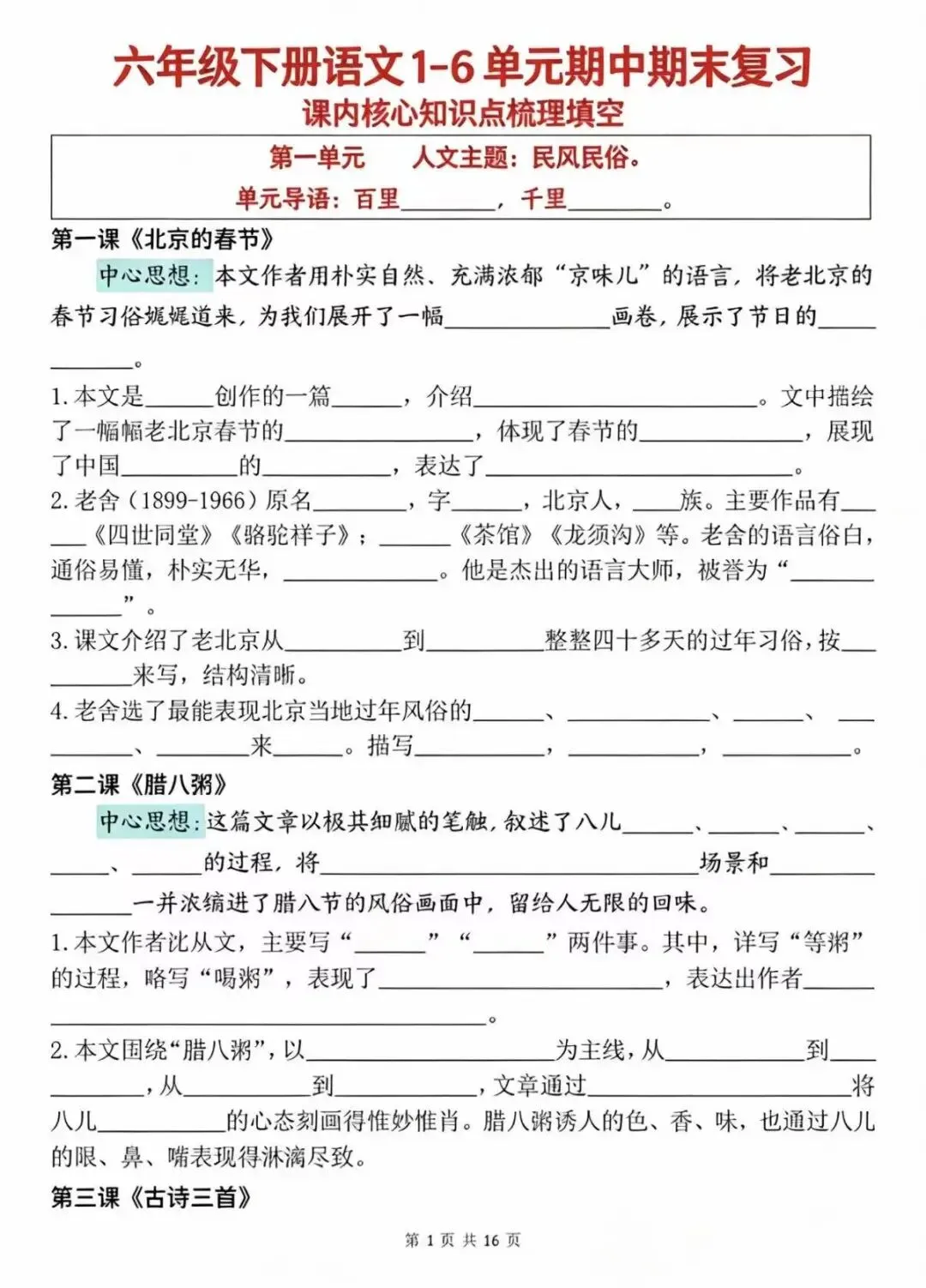 大家好我是白菜学库;今天跟大家分享的是;【自填版+背诵版】六年级下册语文全册课文重点梳理期中期末复习考试必考重点,提供电子版,支持打印和下载。