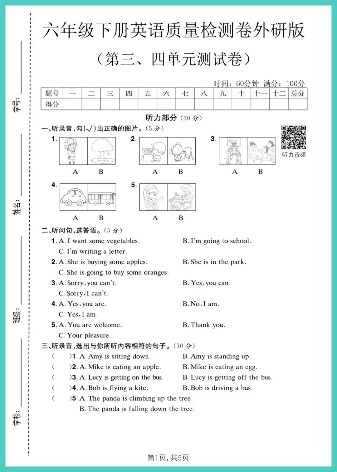 【免费下载】六年级(下)英语_第三、四单元质量检测卷《外研版》 | PDF完整高清电子版可打印