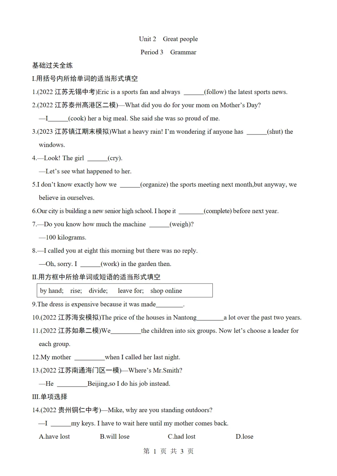 【免费下载】九年级(下)英语Unit2 课时3 同步练习(译林版),PDF电子版,可打印,共3页,先保存,以免资源失效