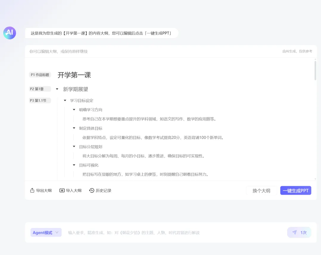 笔格AIPPT是135编辑器出的,主打一个”你只管想内容,排版的事交给我”。输入PPT主题,AI先给你生成一份大纲,觉得不对可以改,改到满意了再出一键排版。