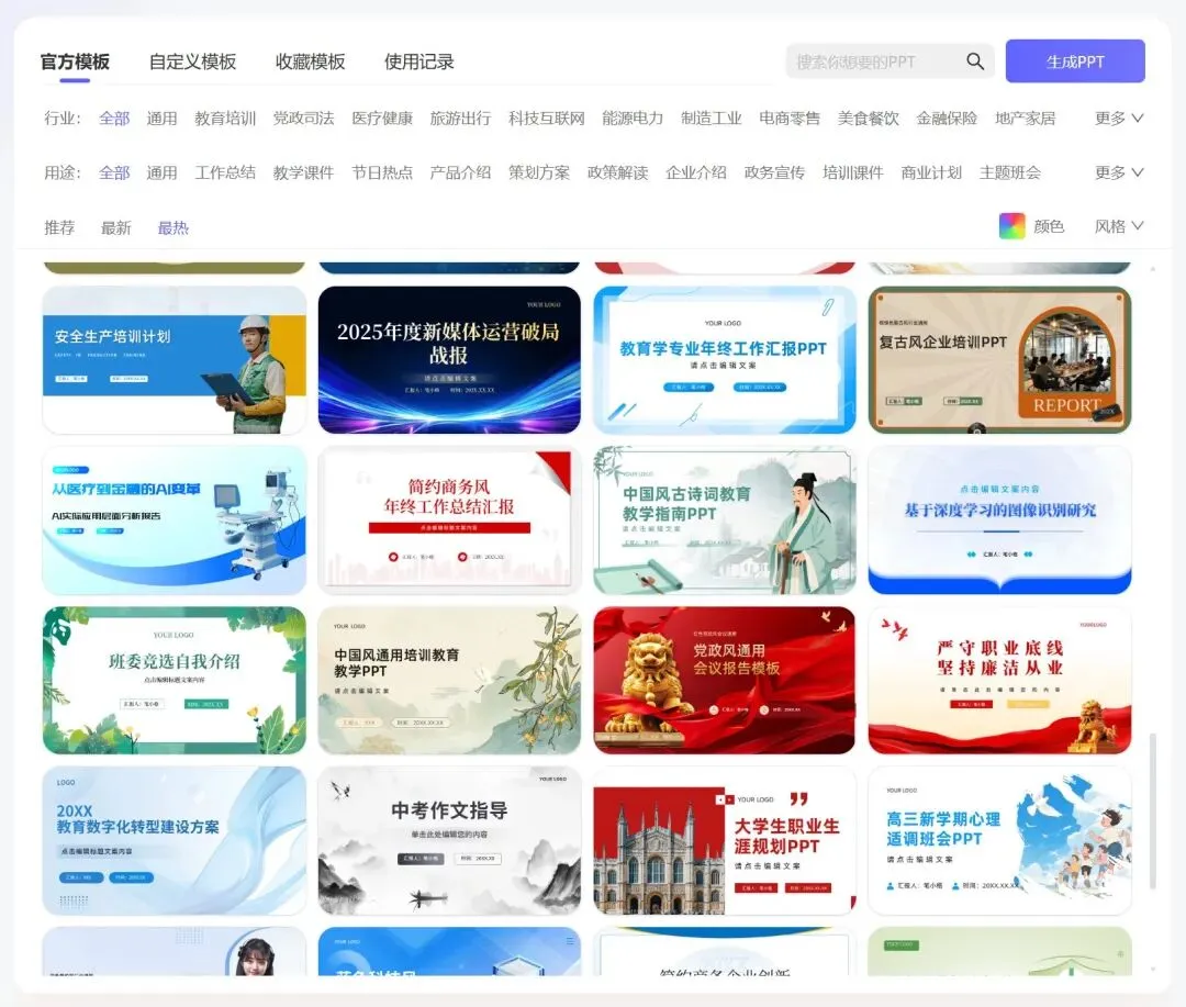 模板库挺丰富的,商务风、学术风、清新风都有,颜色和风格可以自己选。生成之后支持在线编辑,不想用模板也可以传自己的模板上去改。