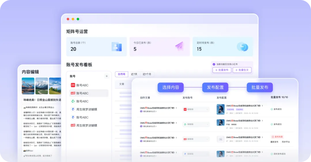 多平台分发是一键到位的,绑定了公众号、小红书、头条这些平台之后,一篇文章自动适配各平台格式发布,数据后台汇总曝光量和互动量,省了来回切换后台的时间。