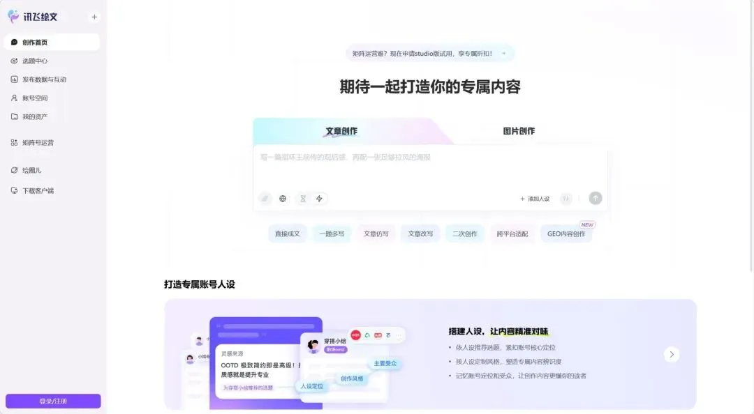 讯飞绘文是科大讯飞出的,主打一个”选题、写作、配图、发布,全链路搞定”。