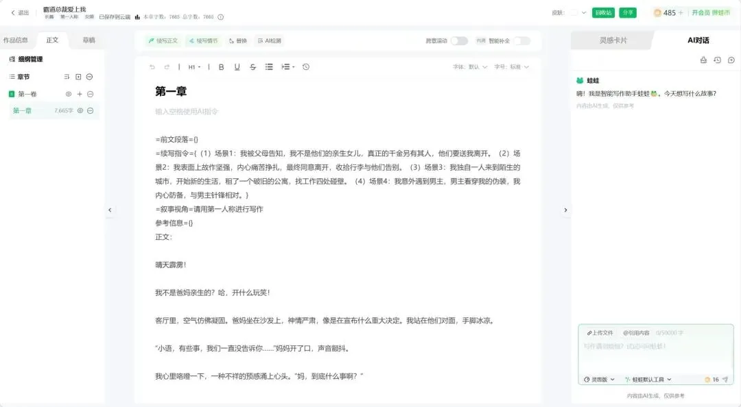 前面几款都是偏通用场景,蛙蛙写作比较垂直——主攻小说和创意写作。