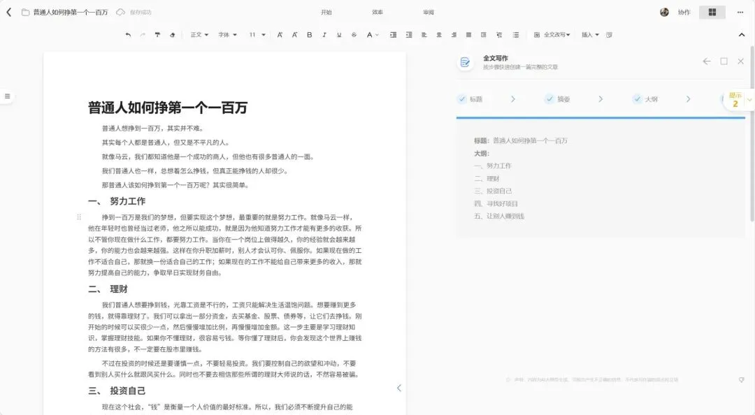 它有一个我比较喜欢的设计:四步写作法——先定标题,再写摘要,然后生成大纲,最后出全文。