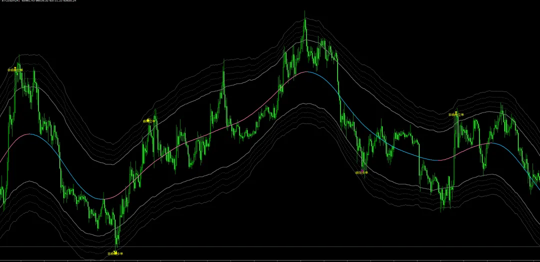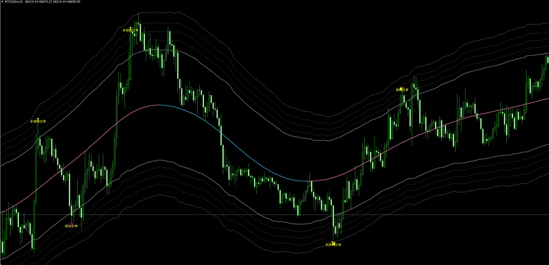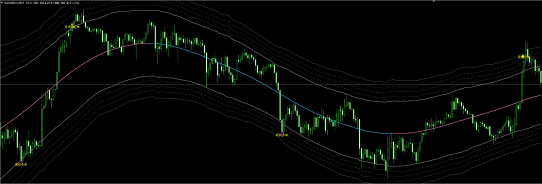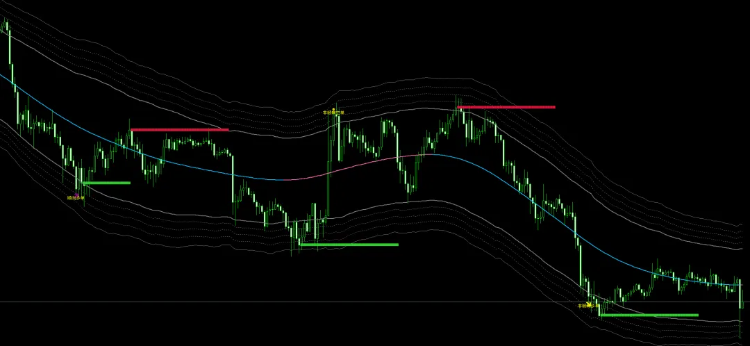 这一款是根据线性回归通道原理,神龙指标也同样来自于这一理论,以均值回归作为主要参考,用来辨别市场走势的极值区域,不管市场如何剧烈波动,终将回归理性,回归到合理的公允区间