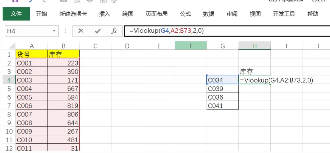 选中A2:B73按下F4 可以锁定匹配公式查找范围,如:, =VLOOKUP(G4,$A$2:$B$73,2,0)