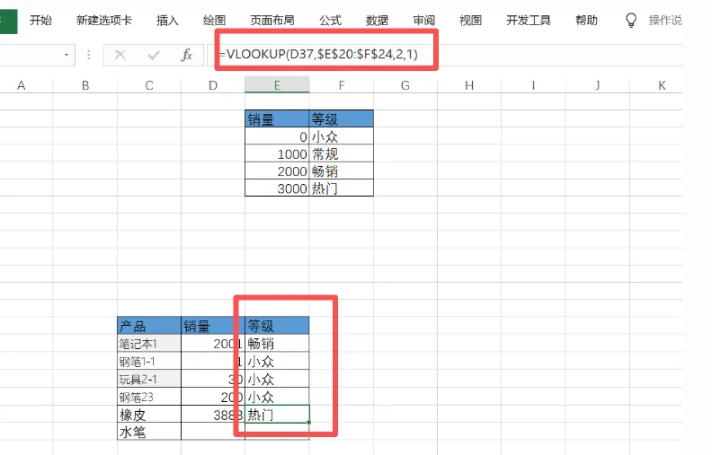 问题:根据销售额自动评定等级(如:<1000为小众,1000-2000为常规,2000-3000为畅销,>3000为热门)。