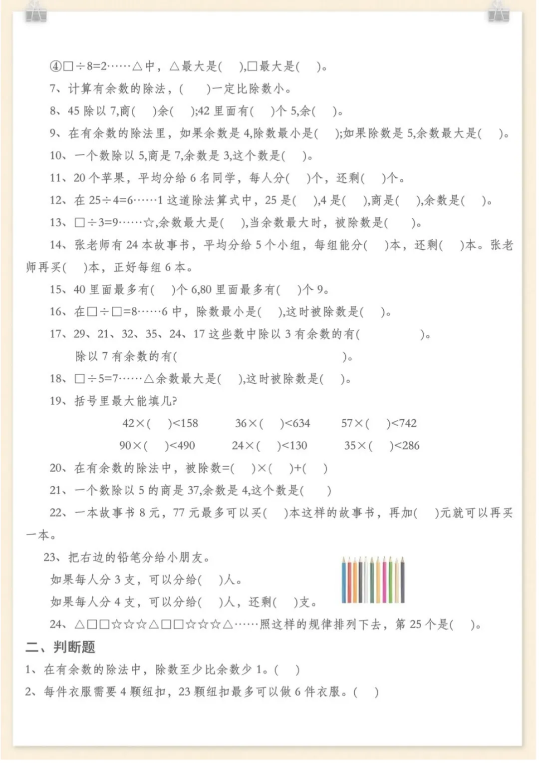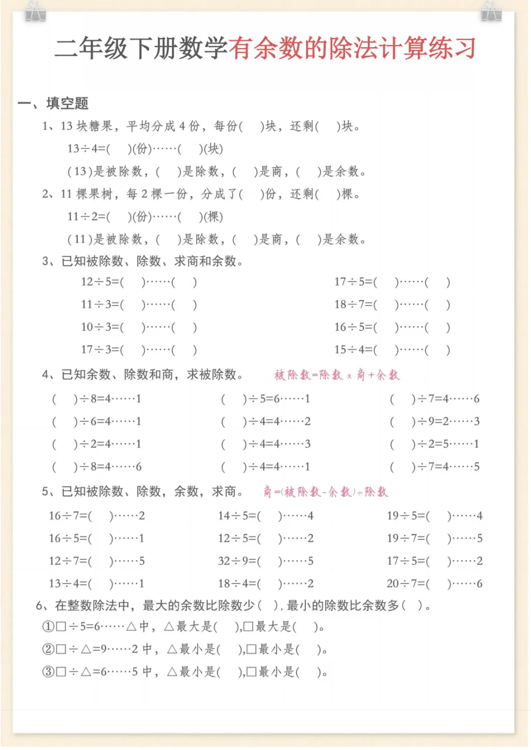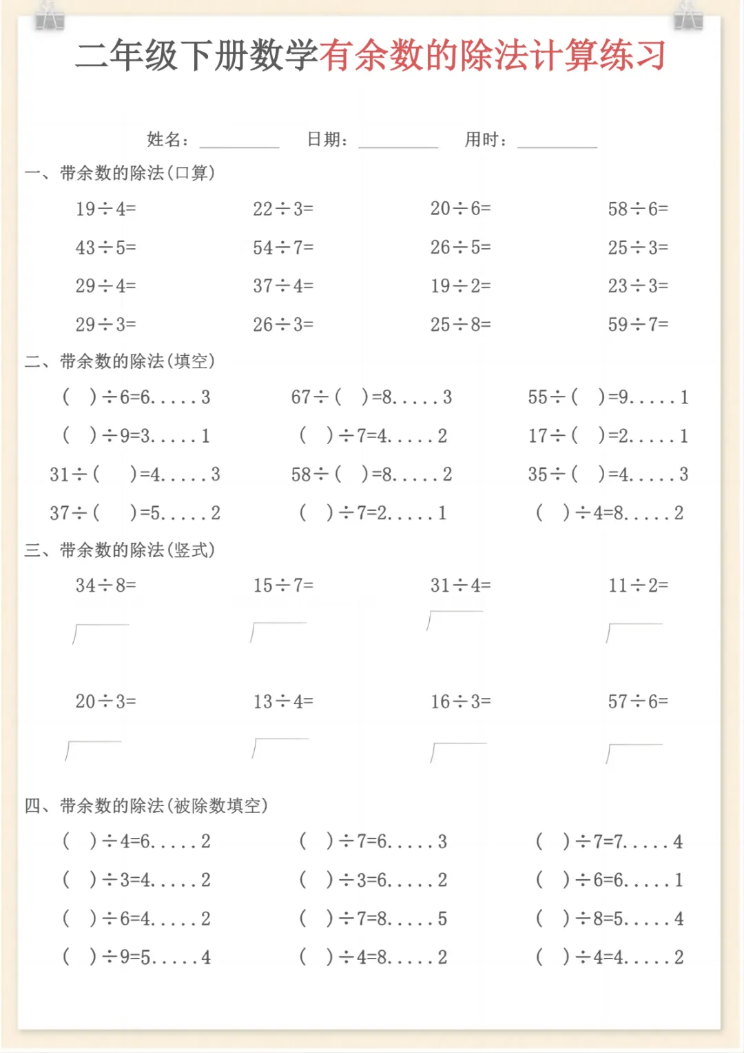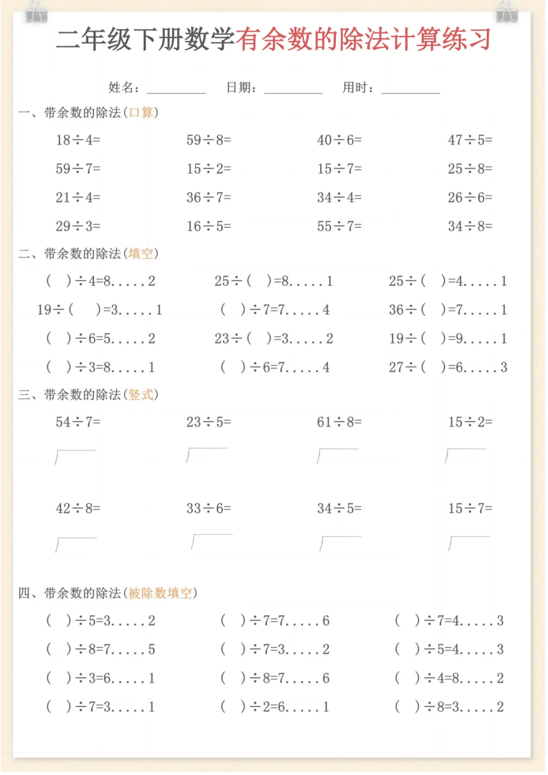 二年级下数学《有余数的除法》计算练习,电子版可打印