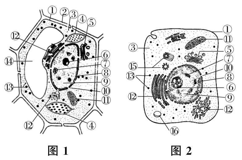 图1是高等植物细胞,图2是动物细胞,鉴别两者的关键是观察有无[②]细胞壁。此外,大部分成熟植物细胞有大液泡,有的有叶绿体;动物细胞无大液泡、无叶绿体,有[⑮]中心体。两者共有的结构有核糖体、内质网、高尔基体和线粒体等细胞器,以及[①]细胞膜、由⑥⑦⑧⑨⑩构成的细胞核。2. 主要细胞器的结构和功能