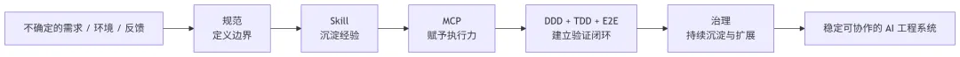 用规范定义边界,用 Skill 沉淀经验,用 MCP 赋予执行力,再用架构、测试、环境和持续治理把不确定不断收敛为确定性,最终把 AI 变成一个稳定可协作的工程伙伴。