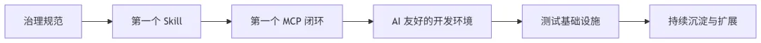 也就是说,不把 AI 工程化当成一个必须先完成的大项目,而是当成一套随着交付逐步补齐的研发基础设施。每当团队在真实项目里遇到一个反复出现的问题,就顺手把它沉淀下来: