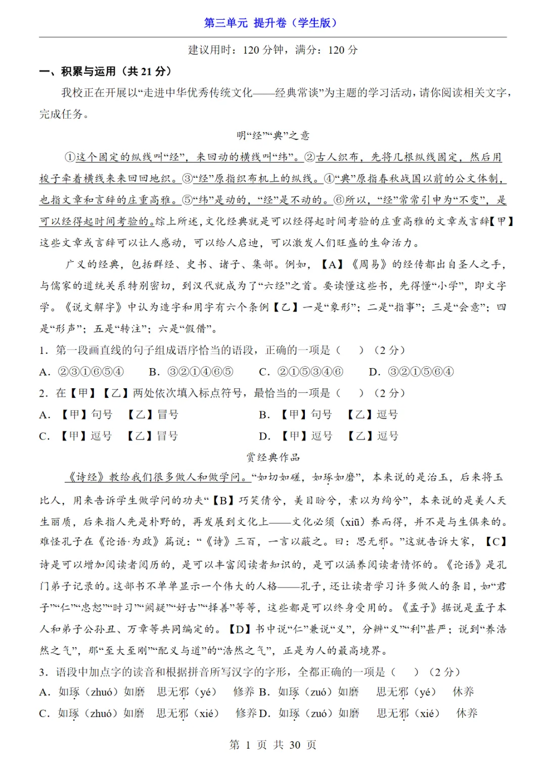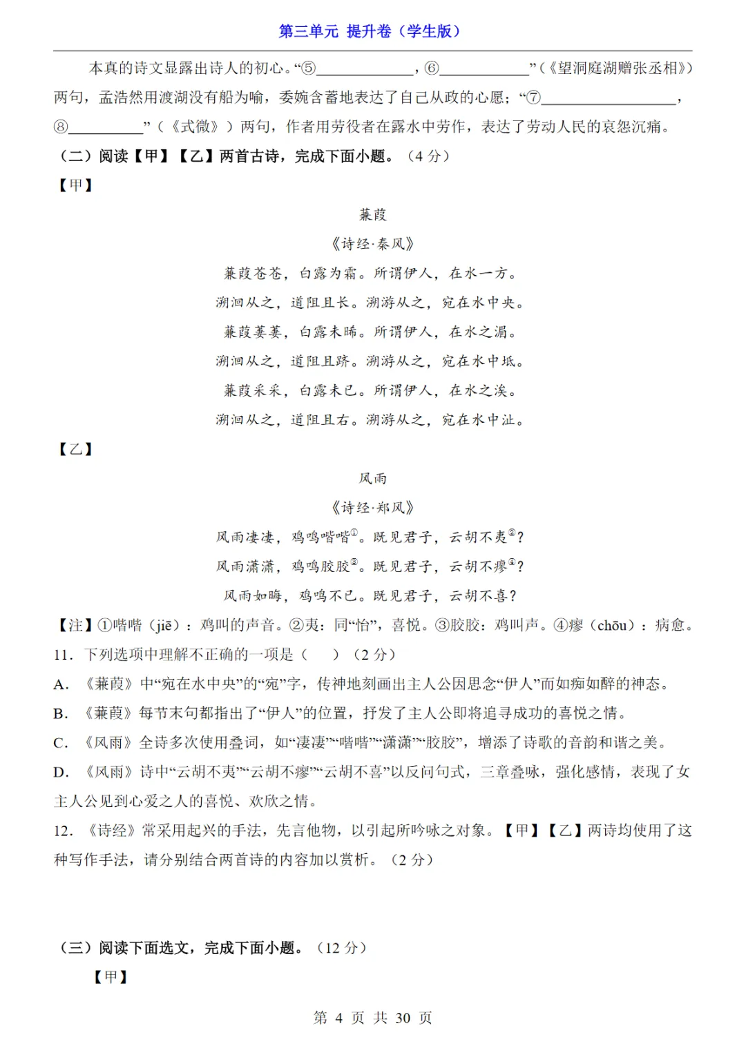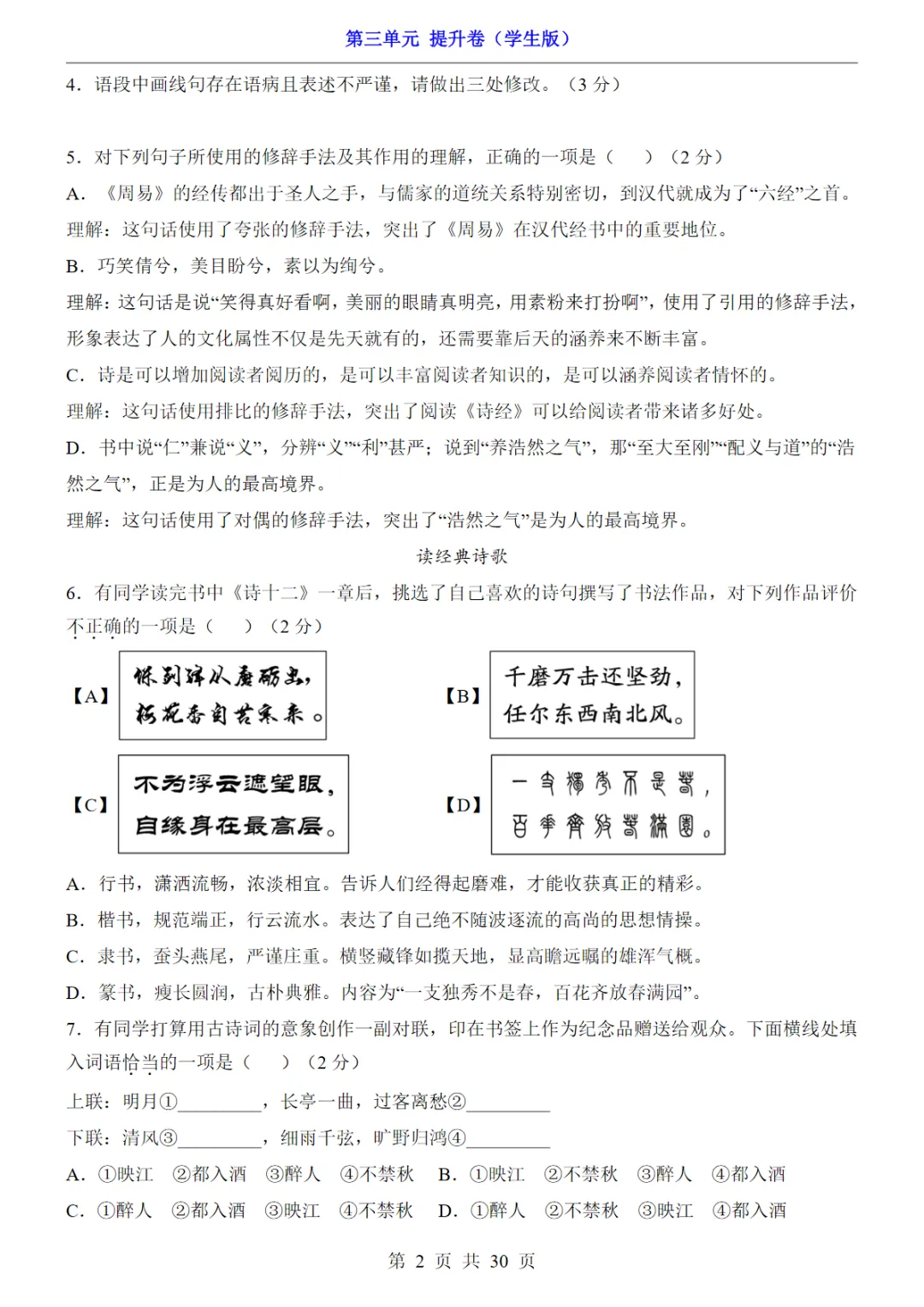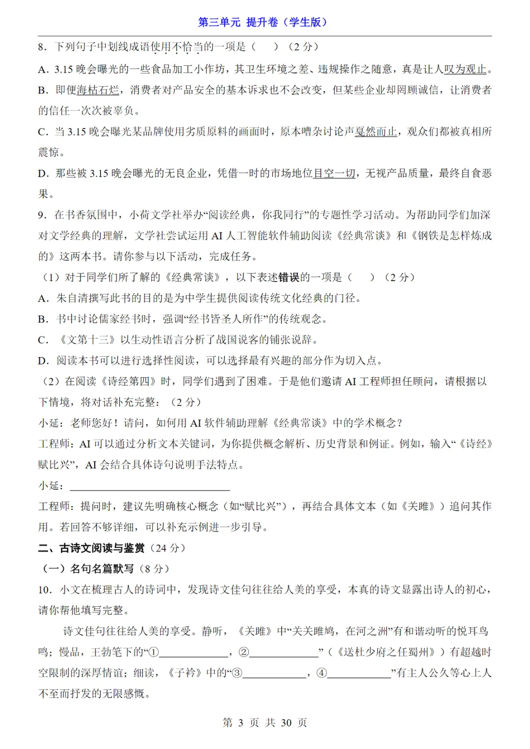 八年级(下)语文第3单元(提升卷),PDF电子版,免费下载,可打印