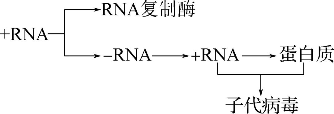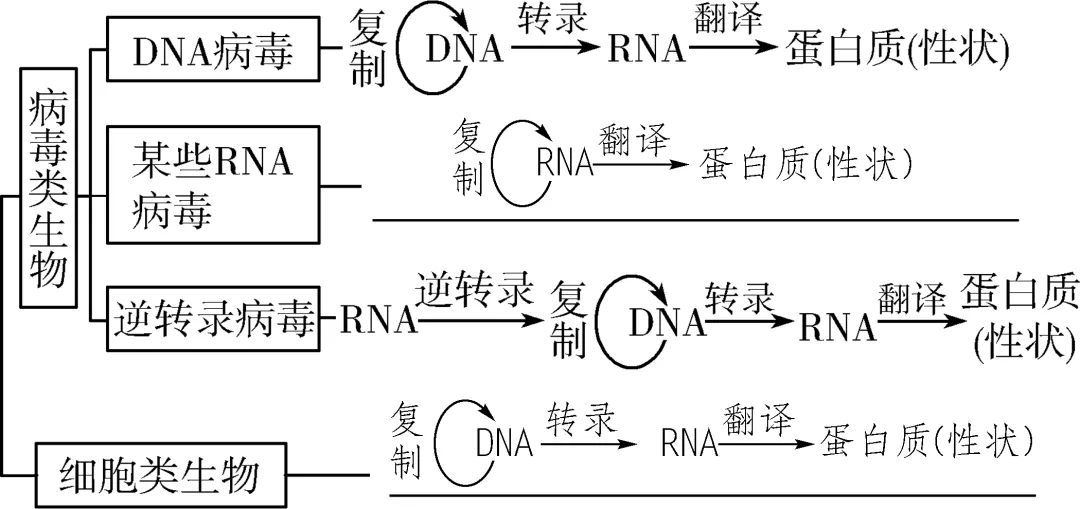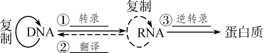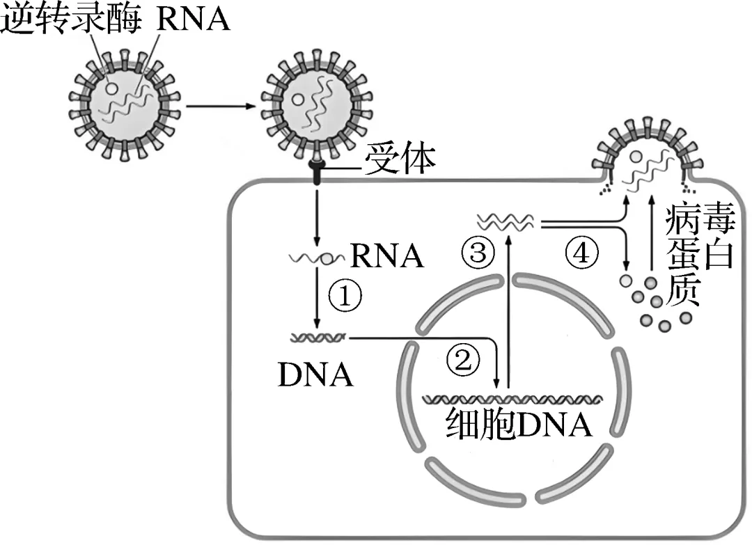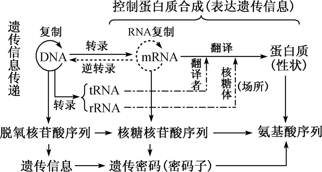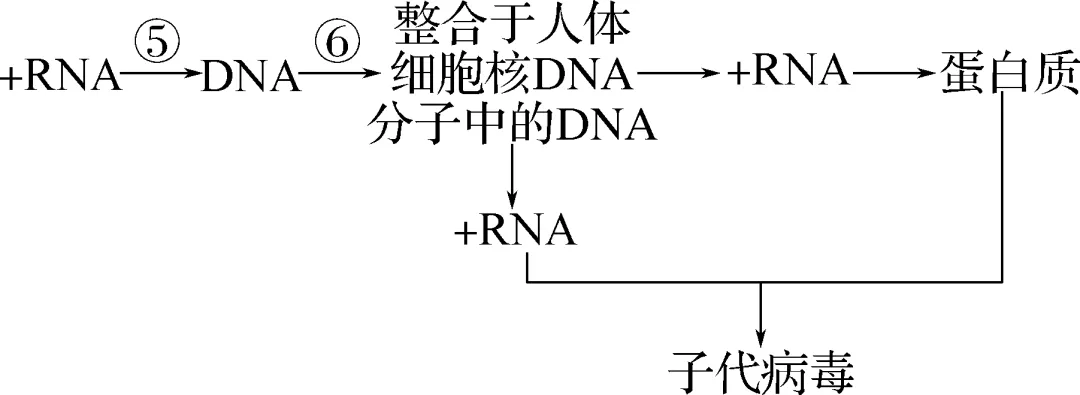 (2)信息表达功能:转录和翻译过程共同体现了遗传信息的表达功能,发生在个体发育过程中;逆转录过程表示了部分以RNA作为遗传物质的病毒(如HIV)以RNA为模板合成DNA的过程,是RNA中遗传信息表达的首要步骤。此类生物营寄生生活,必须在宿主细胞中完成其遗传物质的信息表达,所以需先通过逆转录过程形成DNA,整合在宿主DNA中,再进行转录和翻译过程。逆转录酶伴随着病毒的RNA一起侵染宿主细胞。