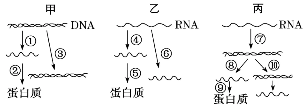(1)根据双链和单链,可判断图中①⑧为转录过程,②⑤⑨为翻译过程,③⑩为DNA复制过程,④⑥为RNA复制过程,⑦为逆转录过程。