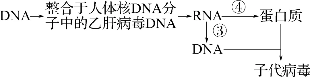 (2)乙肝病毒感染肝细胞后,一般很难根除,原因是乙肝病毒的DNA会整合到人体细胞的DNA中,难以清除。治疗乙肝时,通过药物抑制过程③比抑制过程④的副作用小,这是因为过程③是乙肝病毒增殖过程中所特有的,而过程④在人体蛋白质合成过程中都存在。