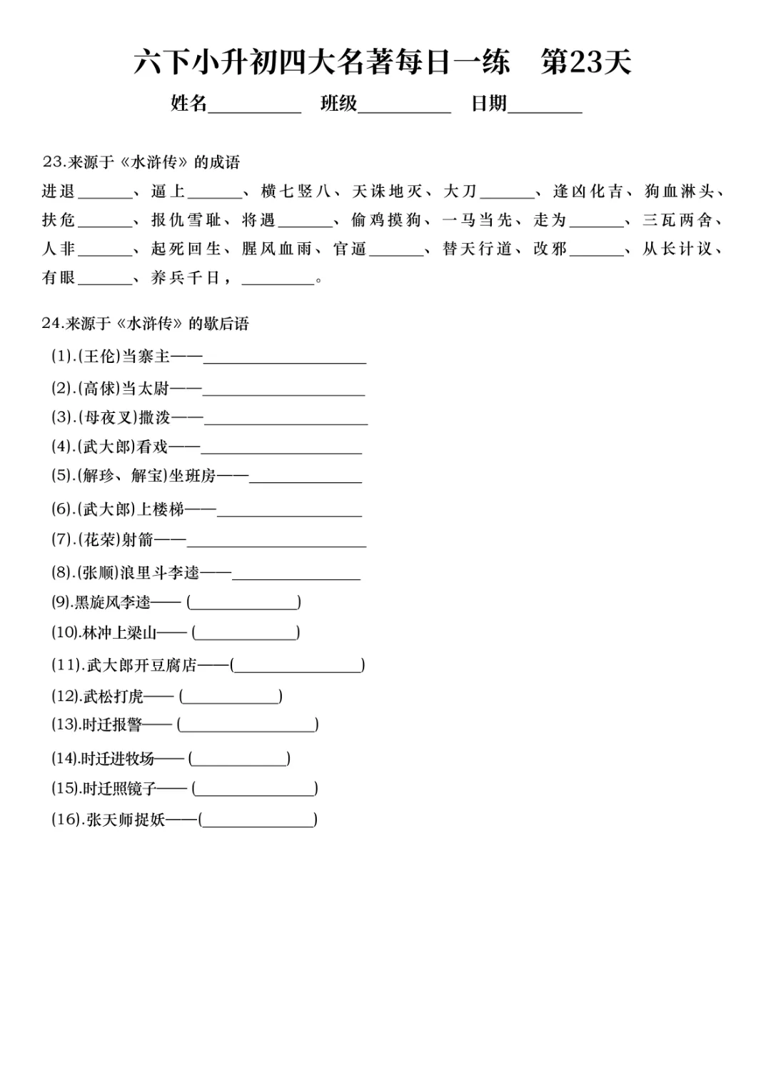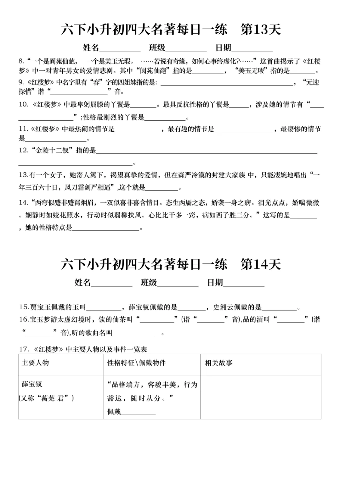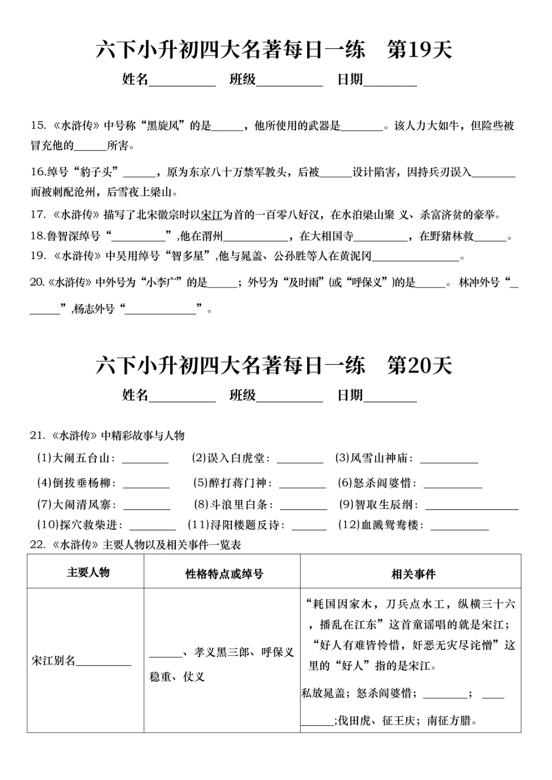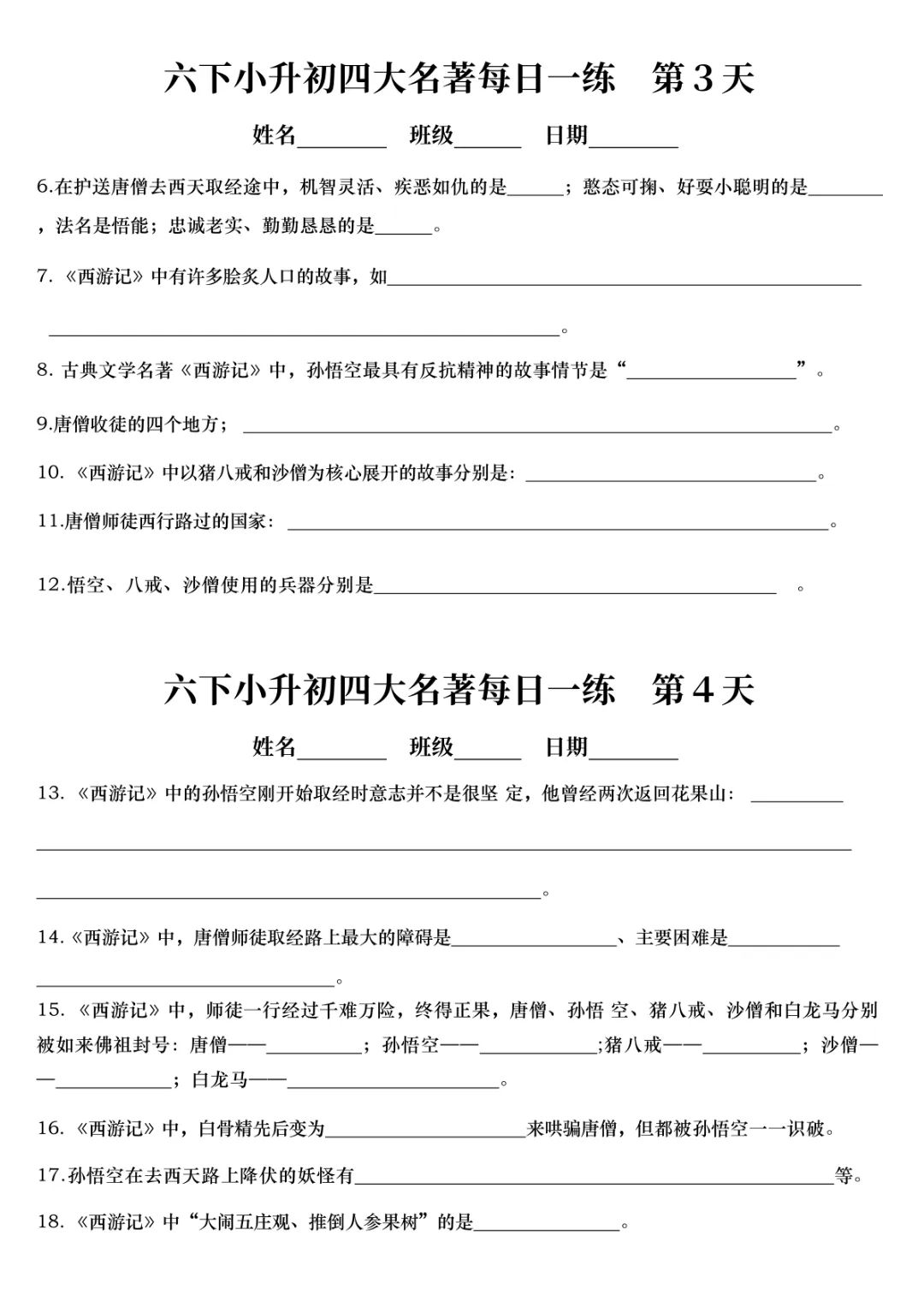 六年级下册语文【通用版】四大名著每日一练带答案丨完整高清可打印