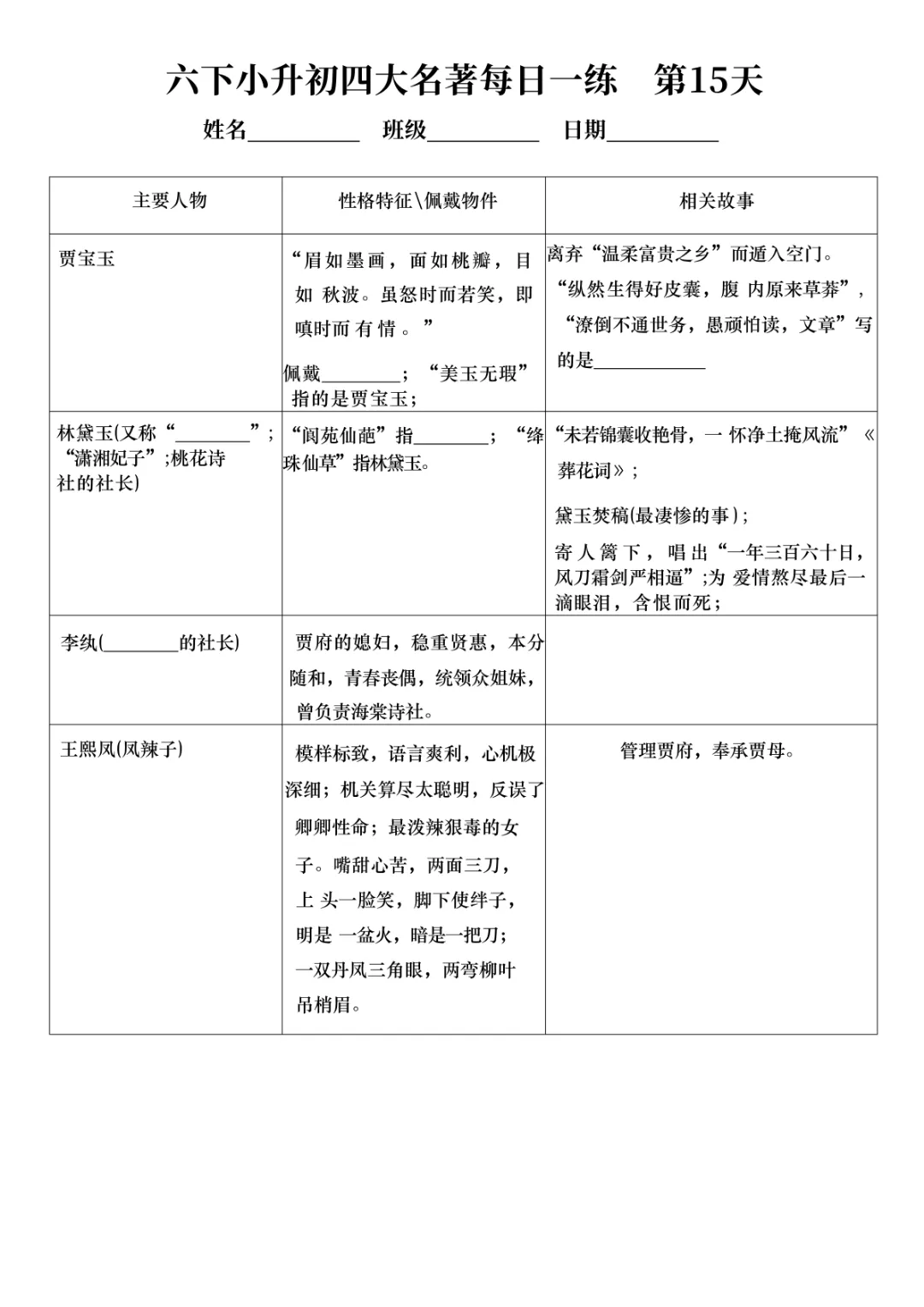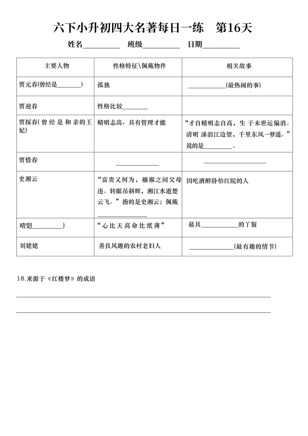 今天给大家分享的是:六年级下册语文【通用版】四大名著每日一练带答案丨完整高清电子版可打印