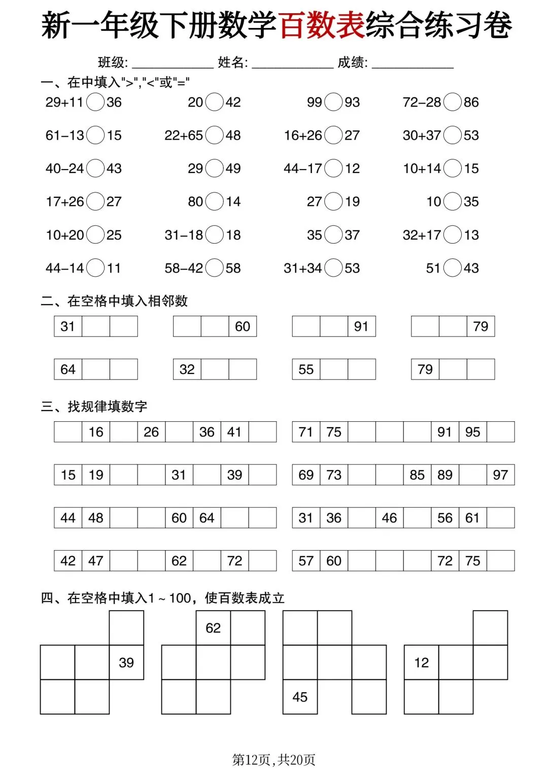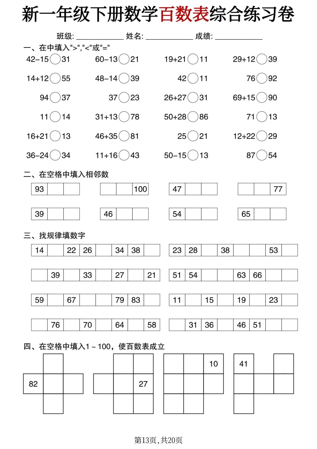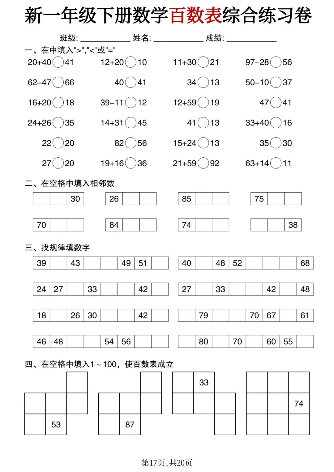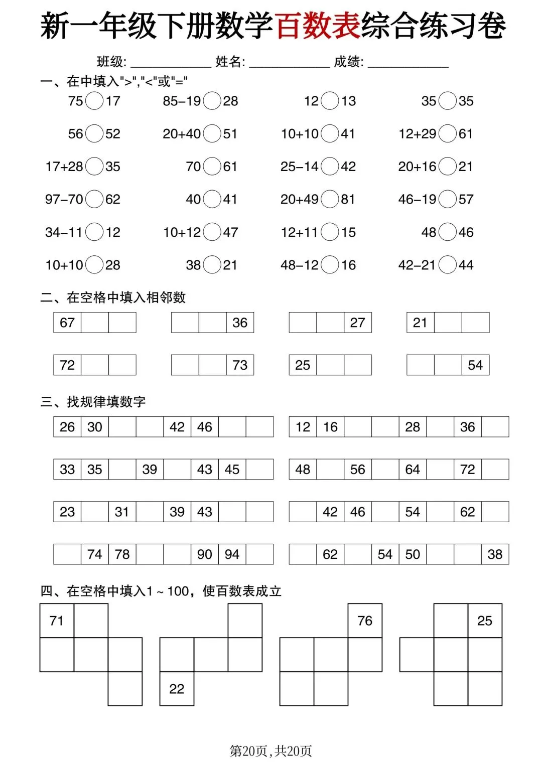 一年级(下)数学百数表综合练习卷,电子版可下载免费