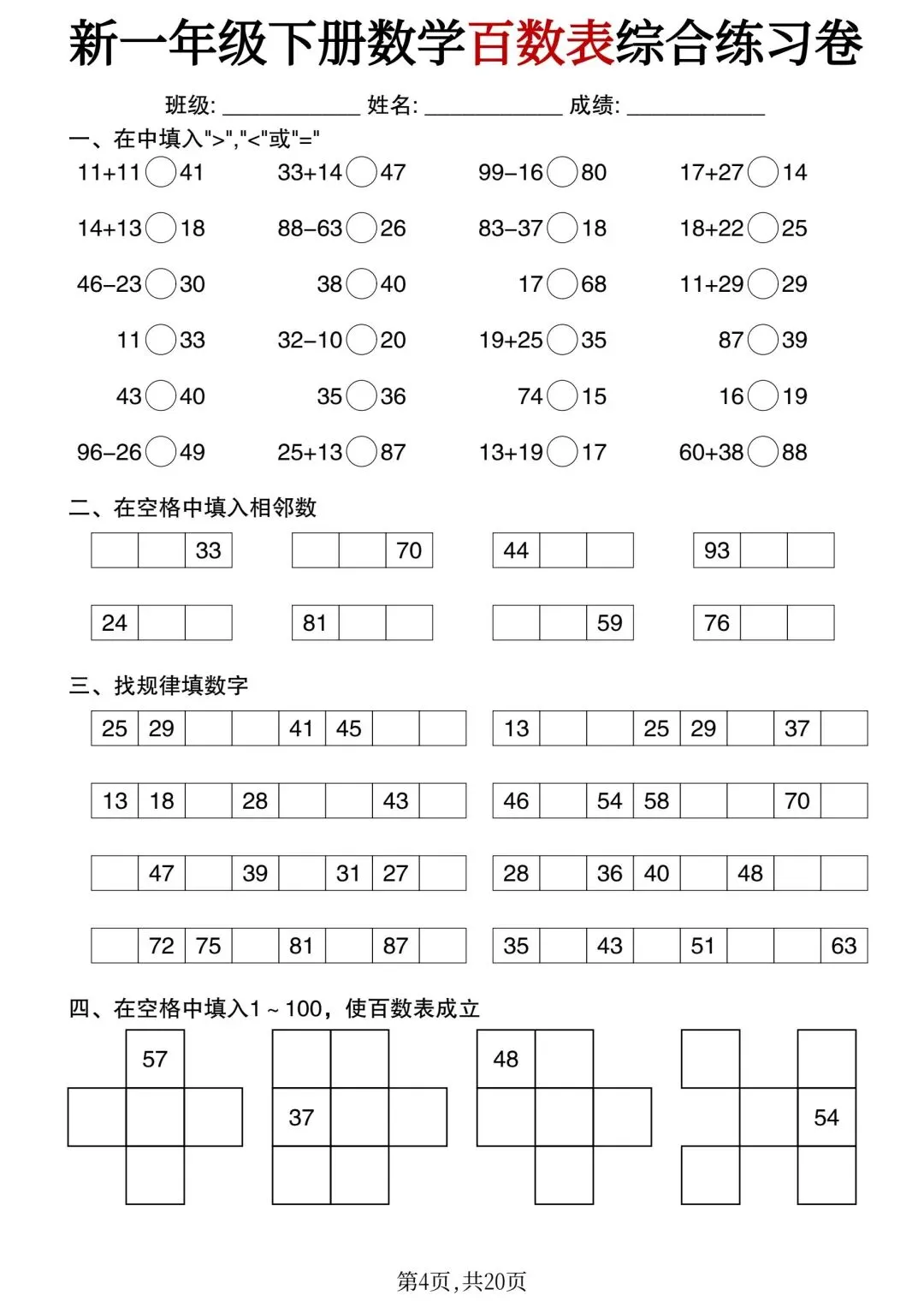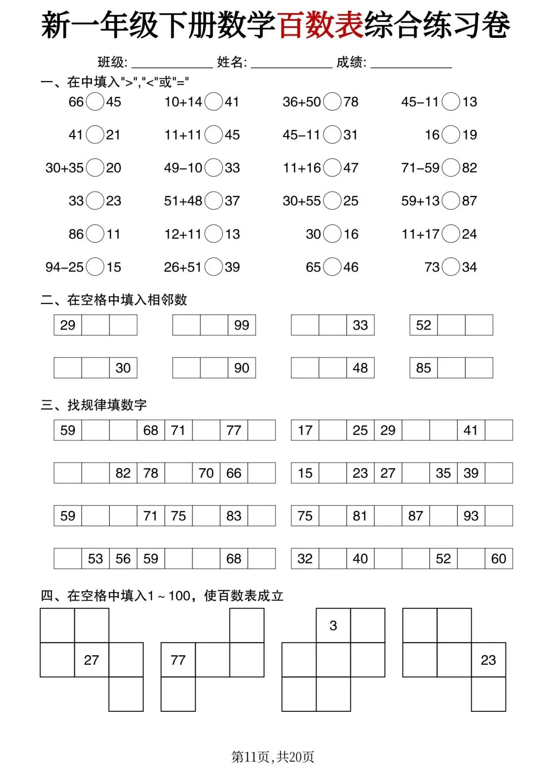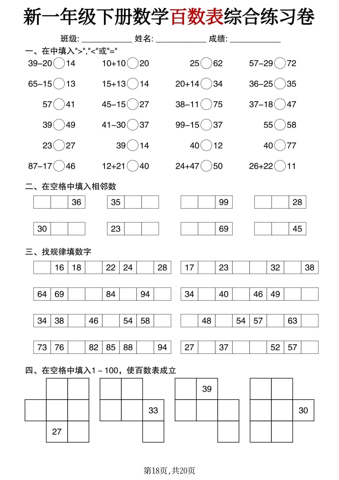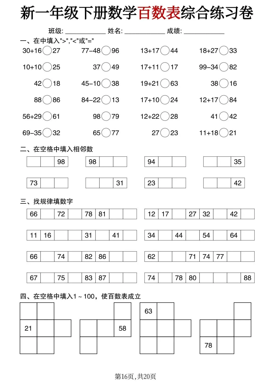 一年级(下)数学百数表综合练习卷,电子版可下载免费